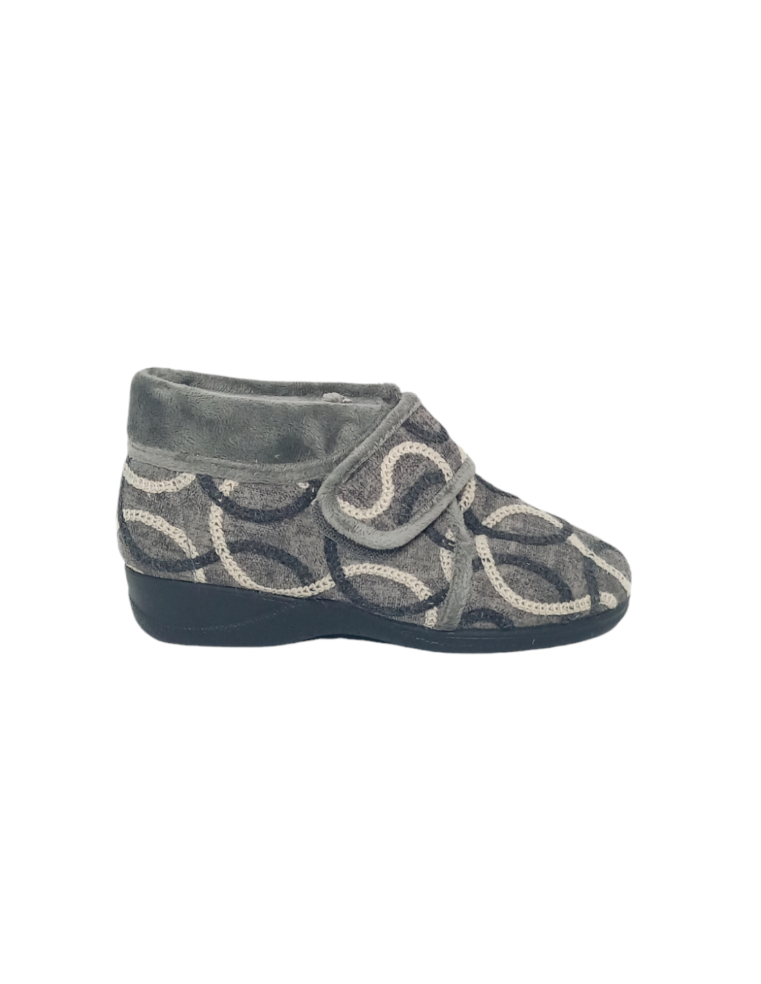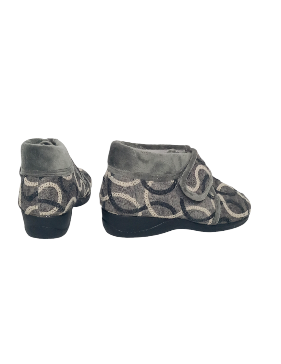 Zapatilla cerrada, realizada en tejidos reciclados, en color gris con estampados circulares en el tejido.