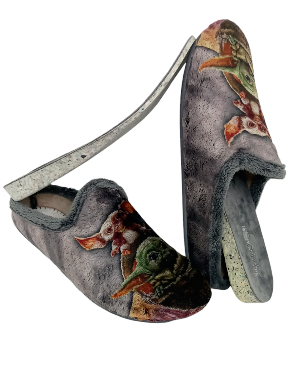 Zapatilla abierta por atrás, confeccionada en tejido jugoso y calentito con dibujo de "Yoda" de "Star Wars" sobre fondo gris.