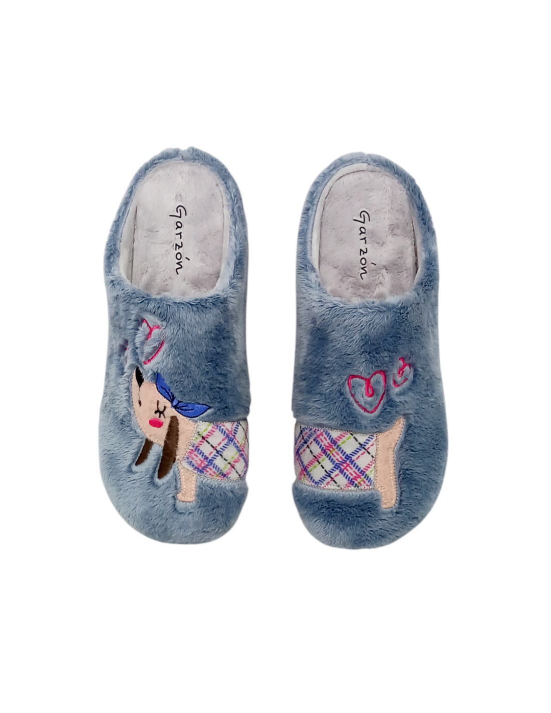 Zapatilla abierta por atrás fabricada en textil de máxima calidad suave al tacto y calentito, en color azul con dibujo de un amoroso perro salchicha dividido entre ambos pies.