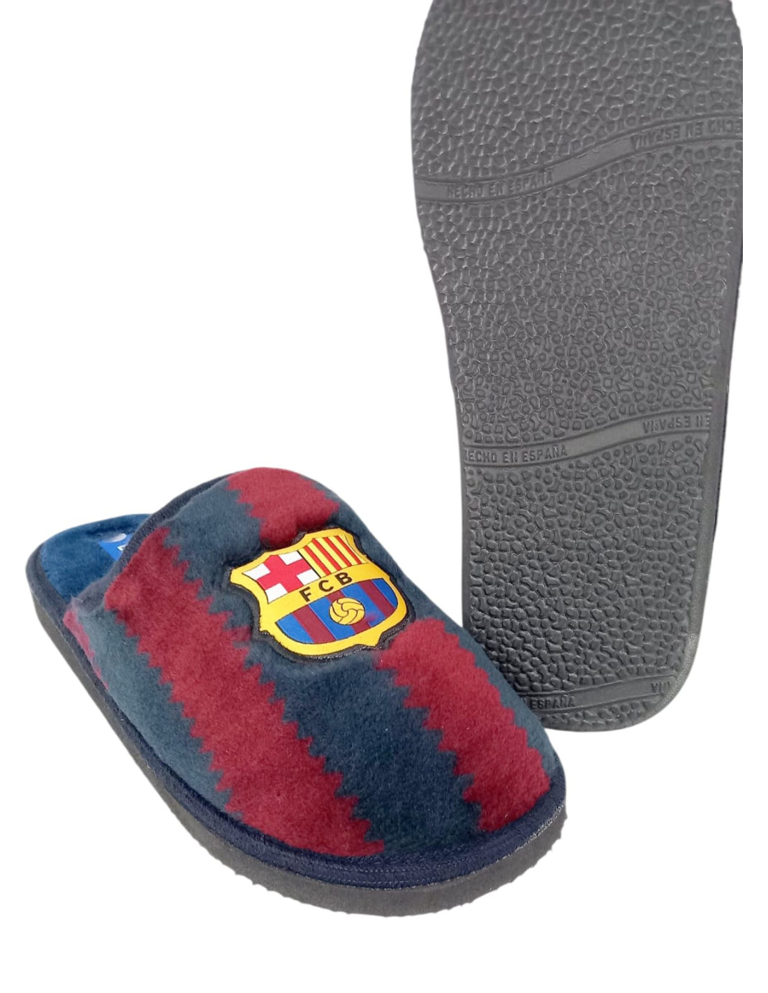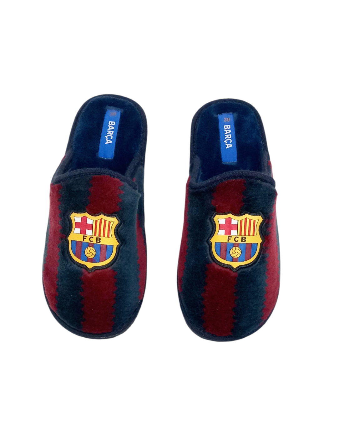 Zapatilla de casa oficial del equipo del Barcelona C.F. para hombre ó mujer, descalza por atrás para un calce más cómodo y fabricada en Suatex, con forro térmico y pelo suave, además de suela antideslizante y ultra-ligera.