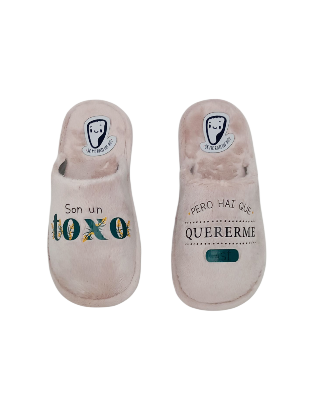 Zapatilla abierta por atrás fabricada en tejido suave en color rosa nude con la frase " Son un toxo" en un pie y la frase "PERO HAI QUE QUERERME ASÍ", en el otro.