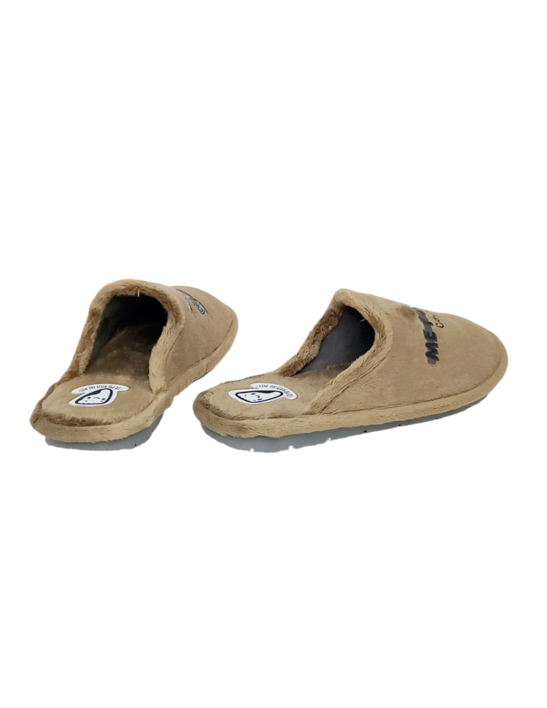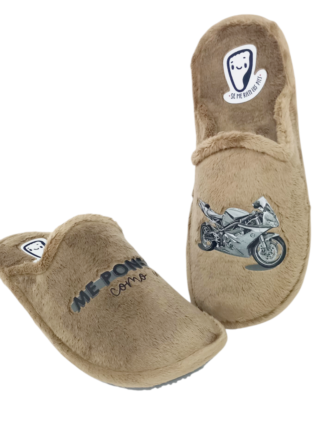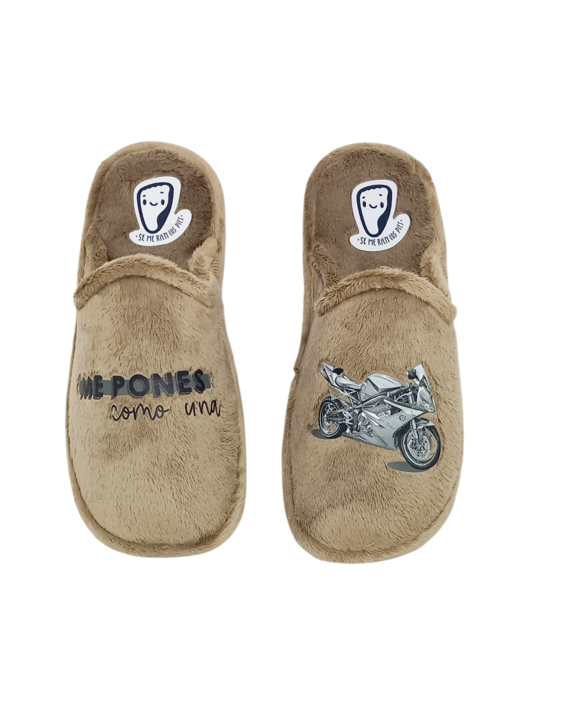 Zapatilla abierta por atrás fabricada en tejido suave en color beige con la frase "ME PONES como una" en un pie y el dibujo de una moto en el otro.