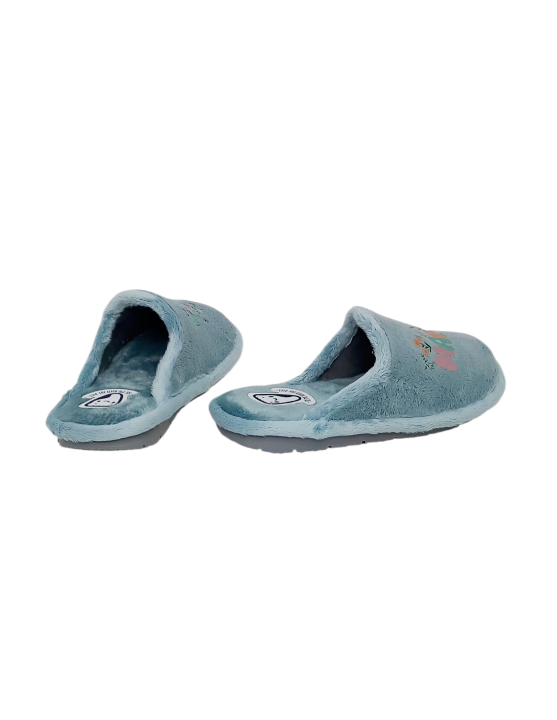 Zapatilla abierta por atrás fabricada en tejido suave en color azul celeste con la palabra "MAMÁ" en un pie y el la frase "te mereces TODO y un poquito más", en el otro.