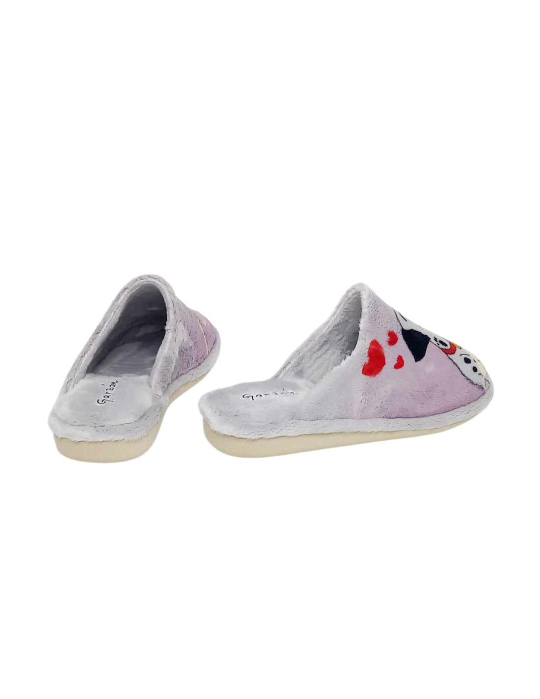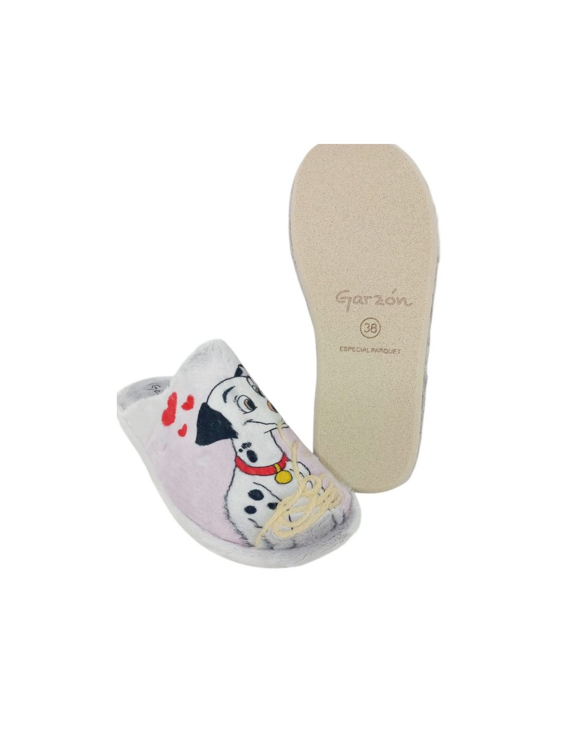 Zapatilla abierta para mujer por atrás fabricada en textil de máxima calidad suave al tacto y calentito, en color gris rosado, con diseño de dos dálmatas enamorados, con un bonito estampado sobre fondo rosa. Plantilla acolchada e interior elaborados en textil.