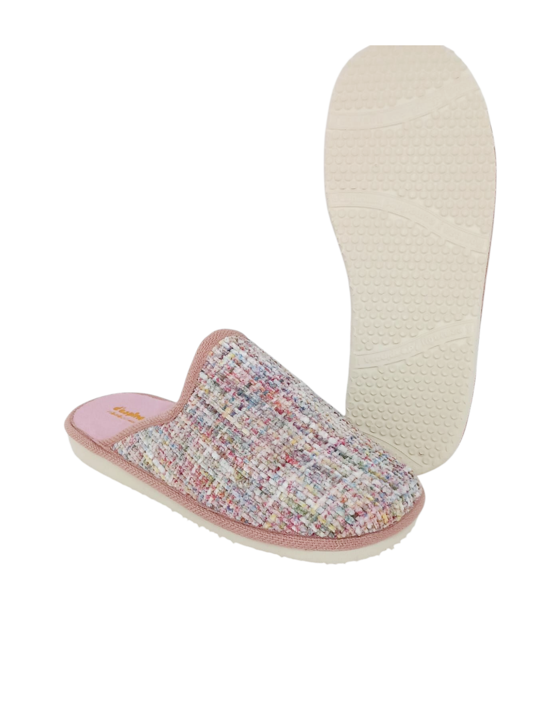 Zapatilla de casa abierta por atrás, fabricada en textil suave jaspeado donde predomina el color rosa
