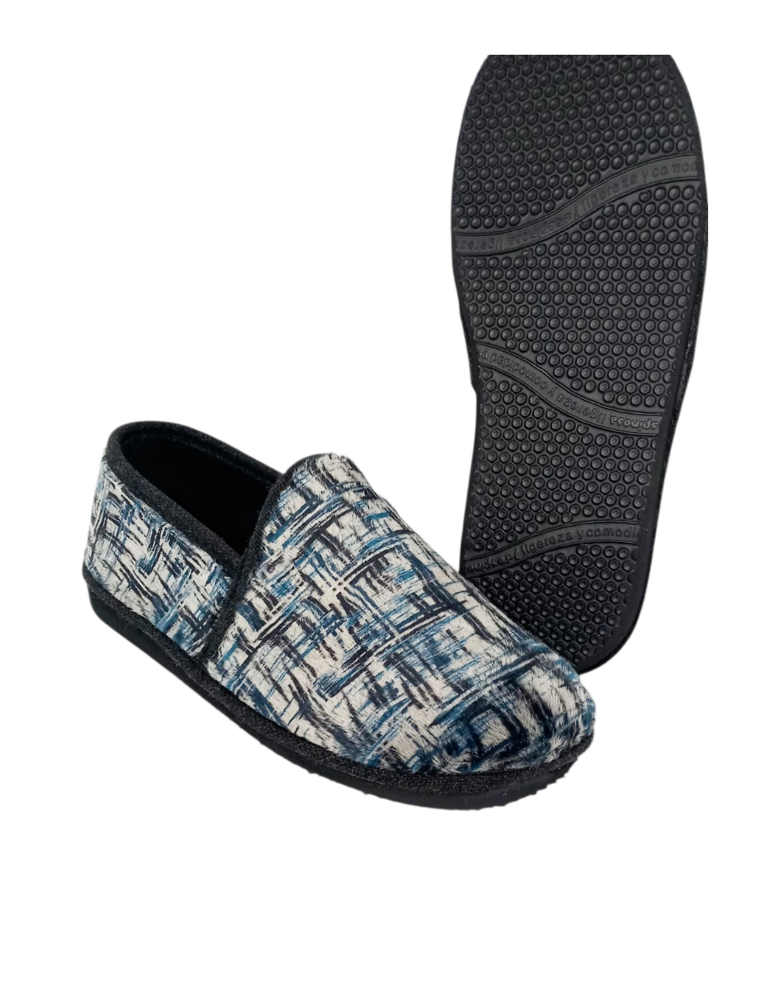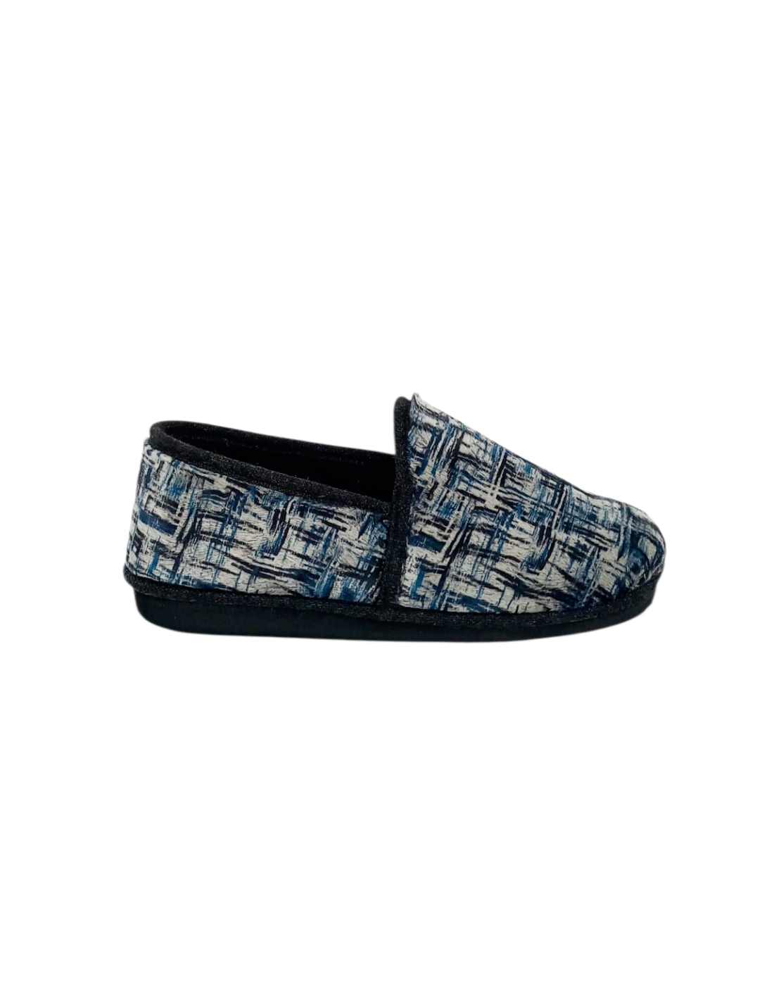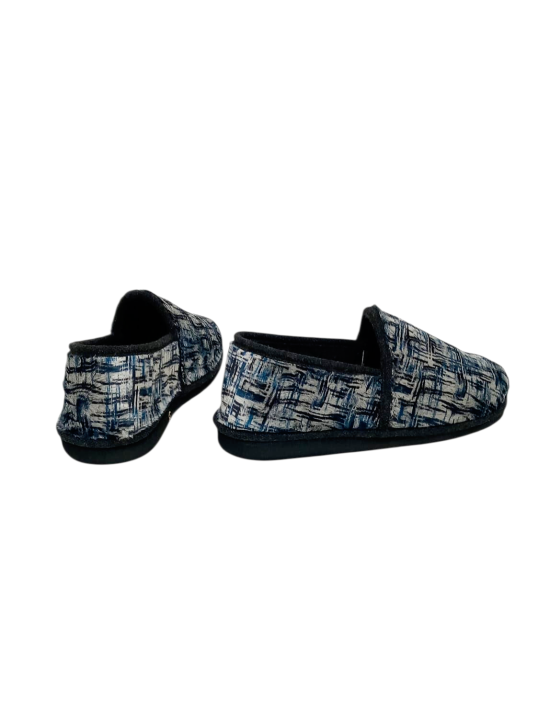 Zapatilla de casa cerrada por detrás con estampado de rayas entremezcladas en colores azul y negro sobre fondo gris.