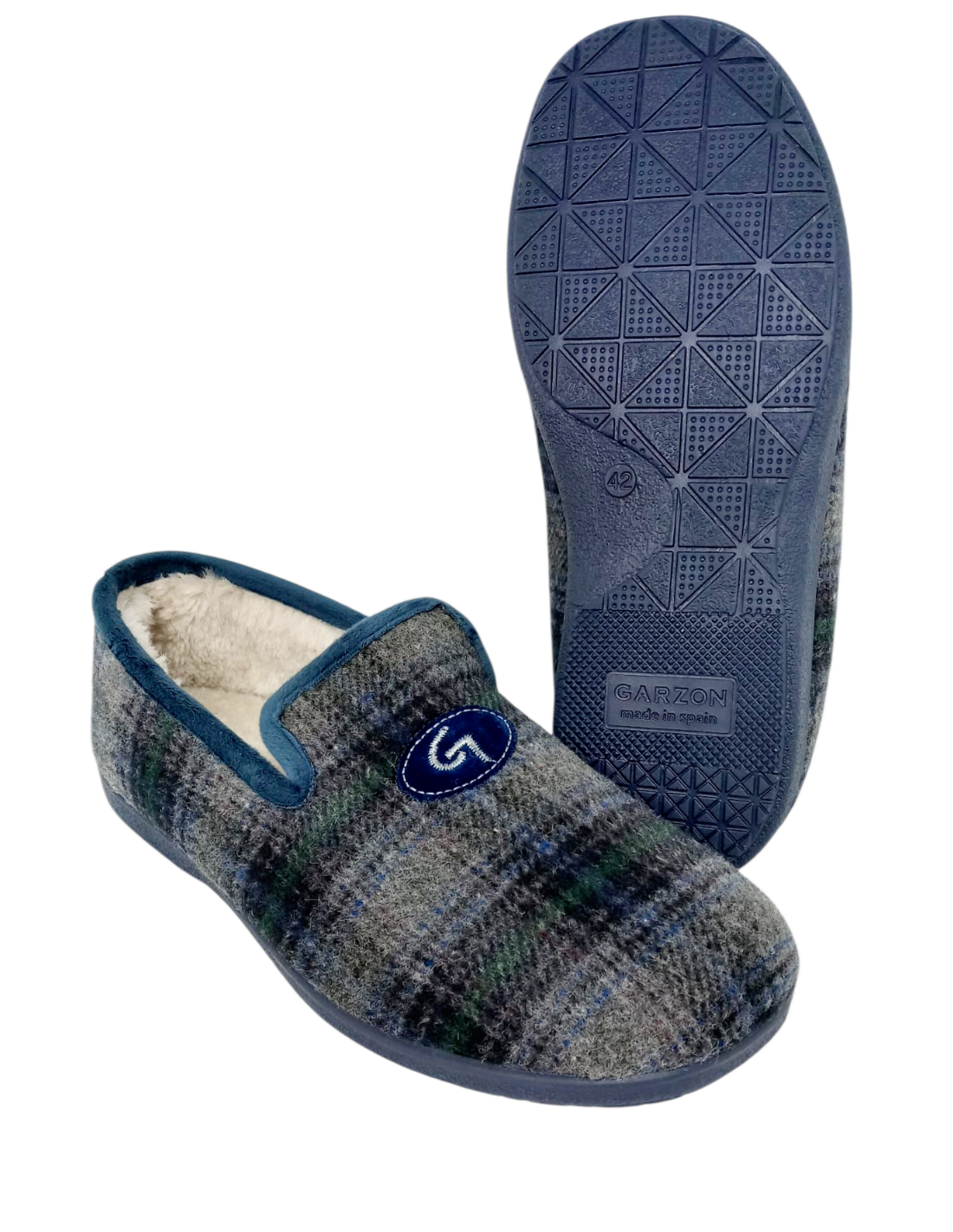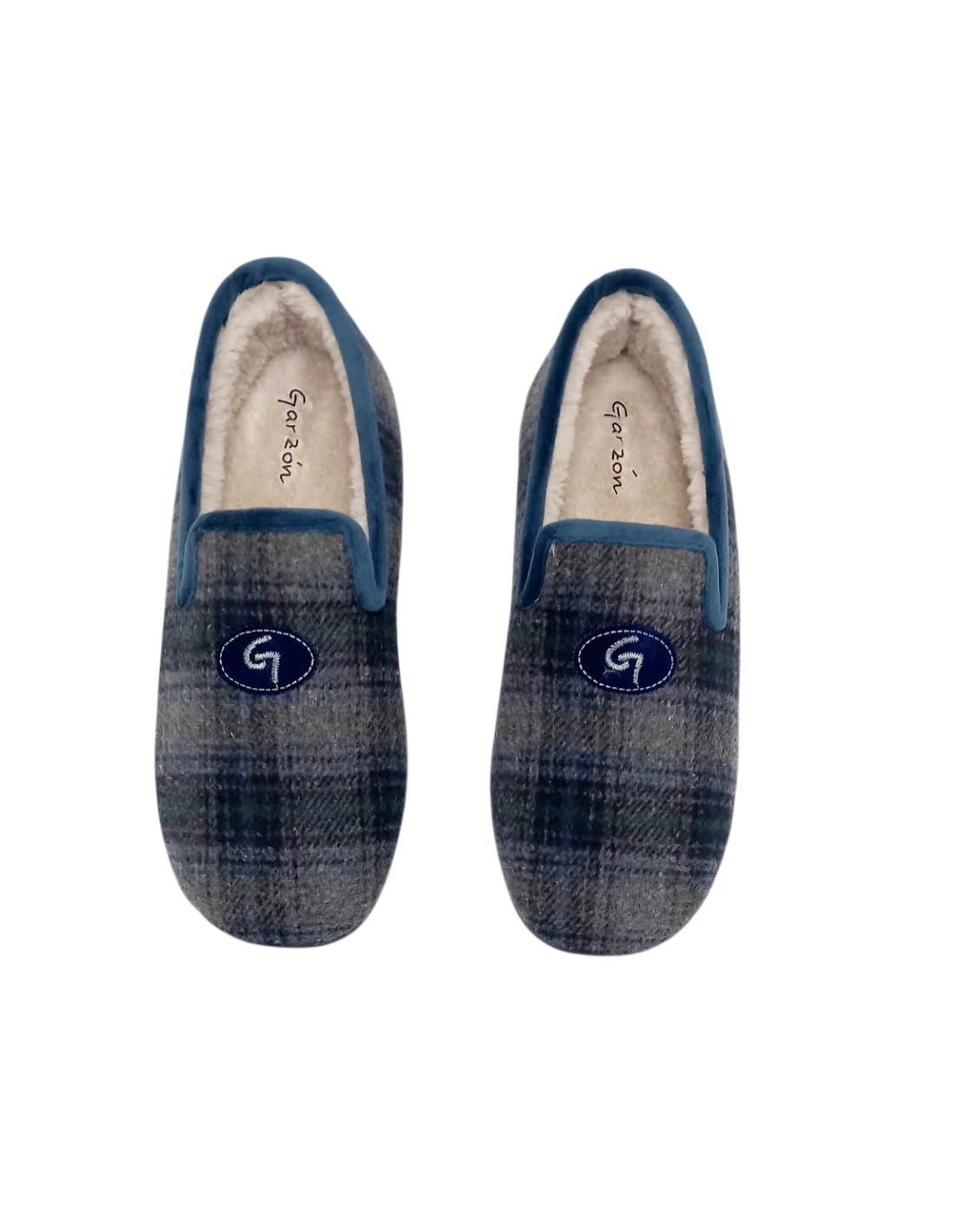 Zapatilla de casa cerrada por detrás, fabricada en material textil tipo paño grueso y calentito con estampado de cuadros donde predomina el color azul.