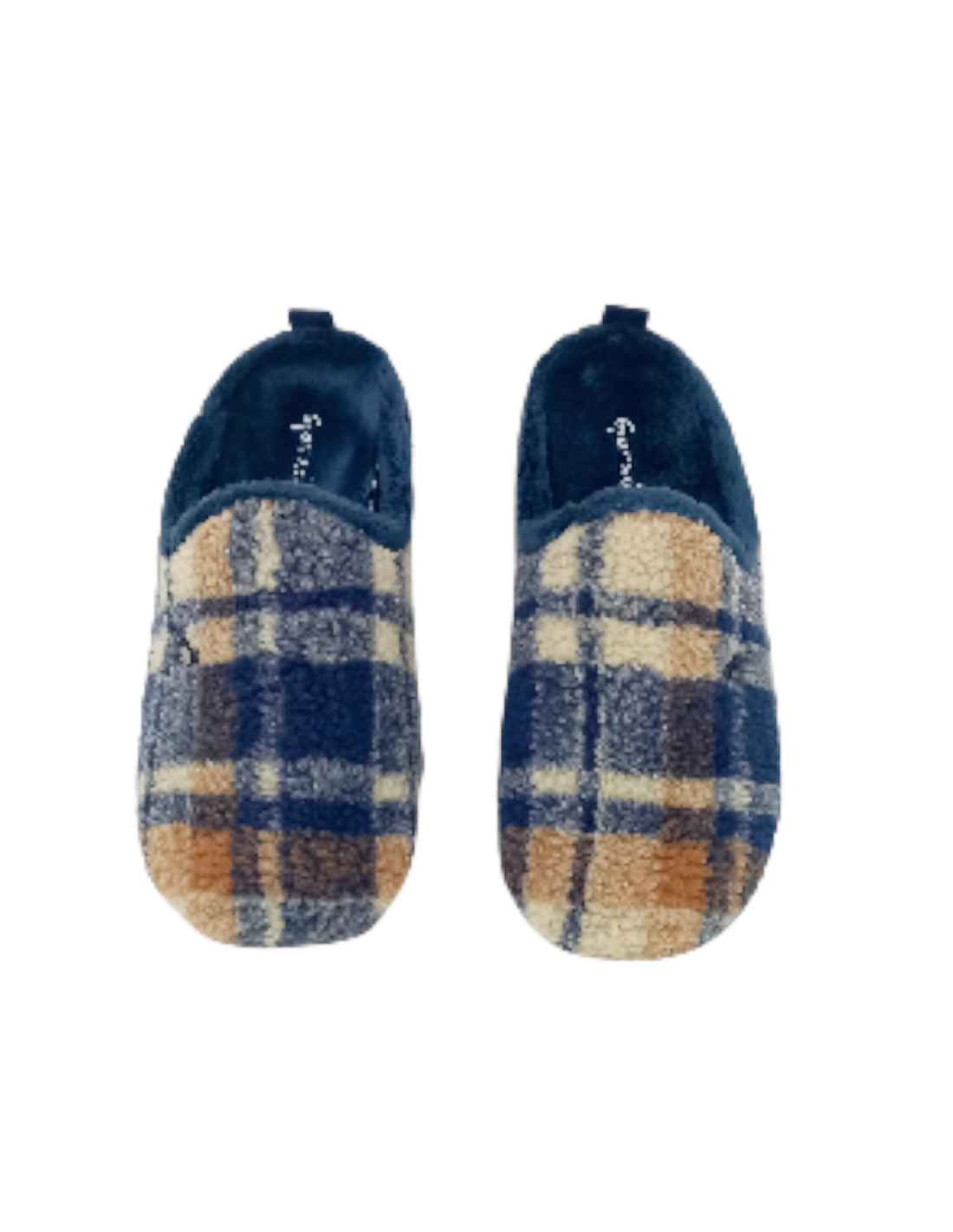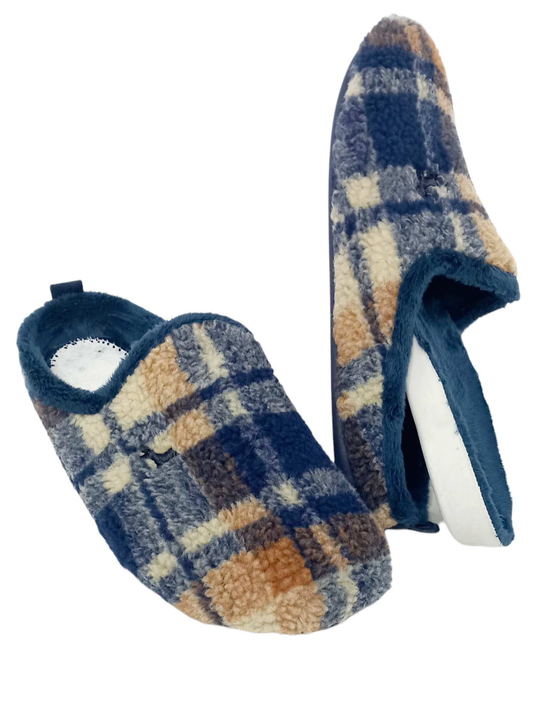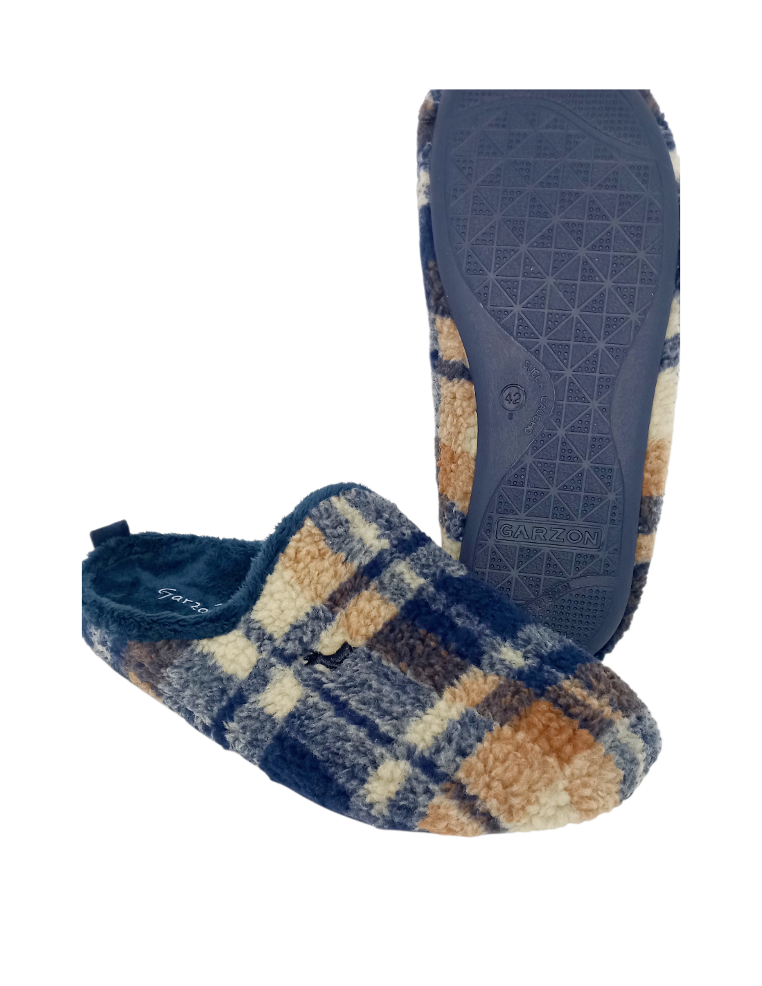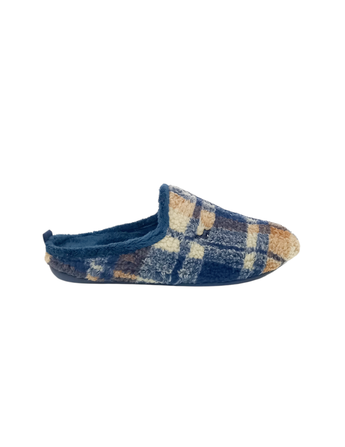 Zapatilla de casa abierta por detrás, fabricada en tejido suave y calentito para el invierno tipo lana rizada, con estampado de cuadros en tonos azules, camel y beige, con el forro interior muy suave al tacto.