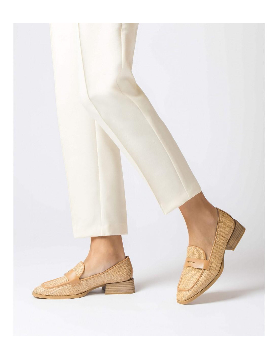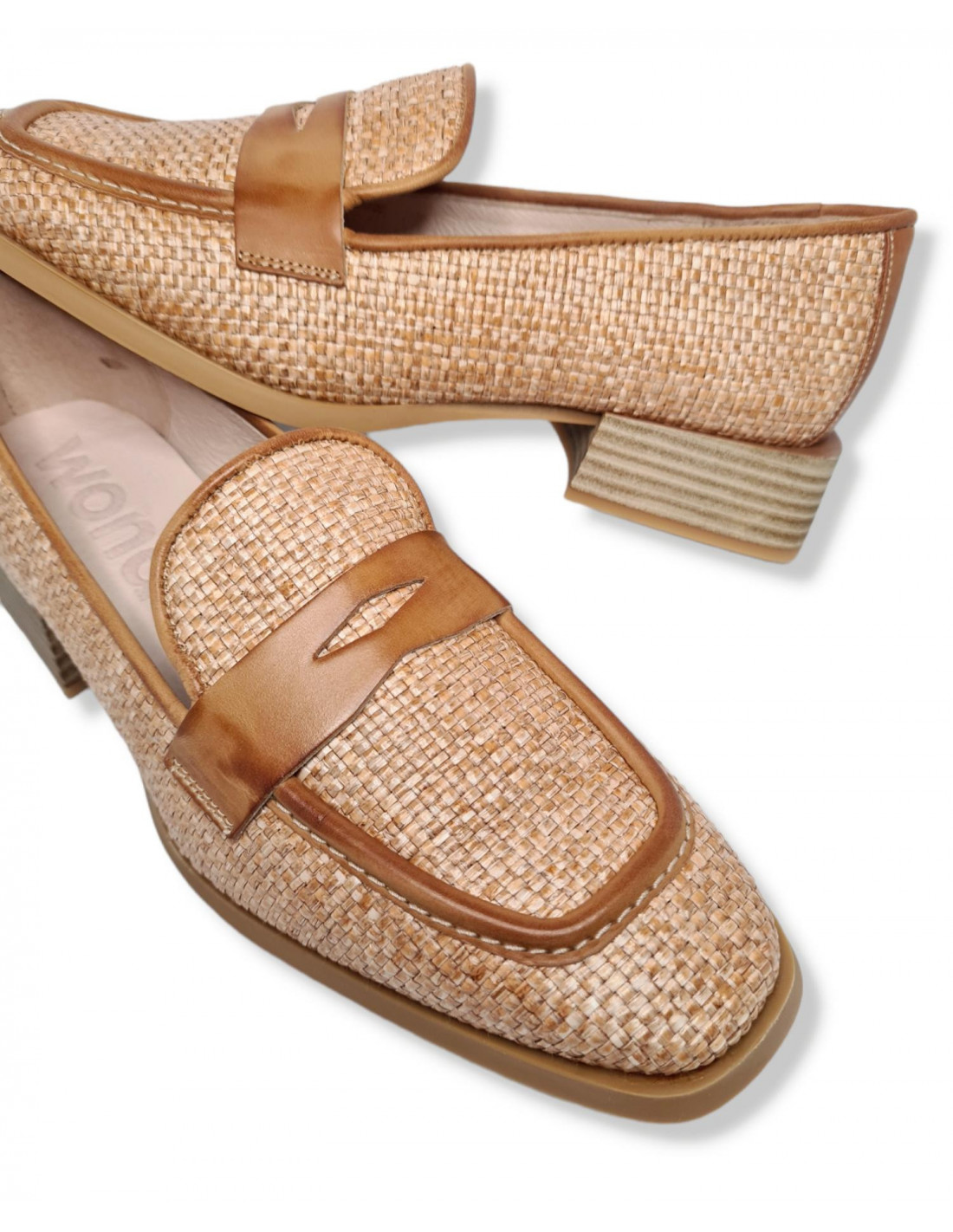 Mocasín en rafia el 90 % y piel vacuna el 10% color camel. Un diseño con adorno de piel en la solapa, tacón cuadrado midi de 3 cm de altura y punta cuadrada. Forro y plantilla en piel con suela flexible de TPU, un modelo super cómodo y con un confort impresionante.