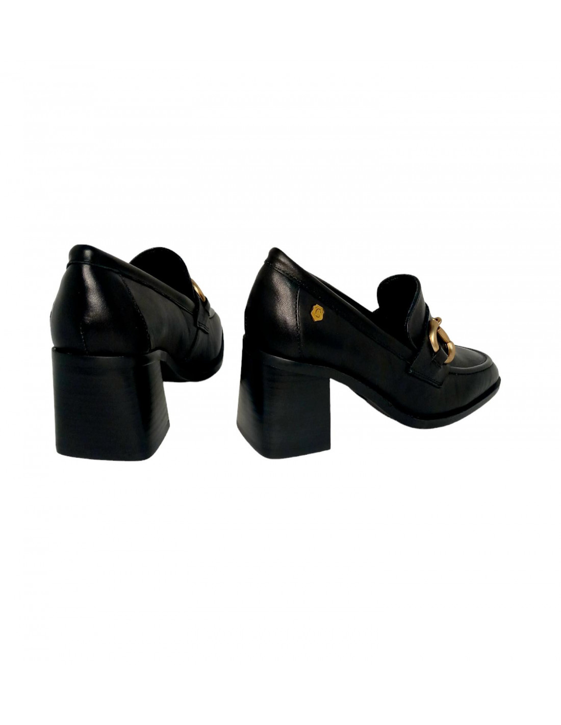 Zapato en piel color negro, un diseño super moderno con copete y adorno dorado en empeine. Punta redonda y logo de la marca en el lateral. Interior en piel y textil, experimenta una sensación óptima de confort gracia a las suaves plantillas que se adaptan a tus pies. Suela de goma con tacón ancho de 7 cm de altura.