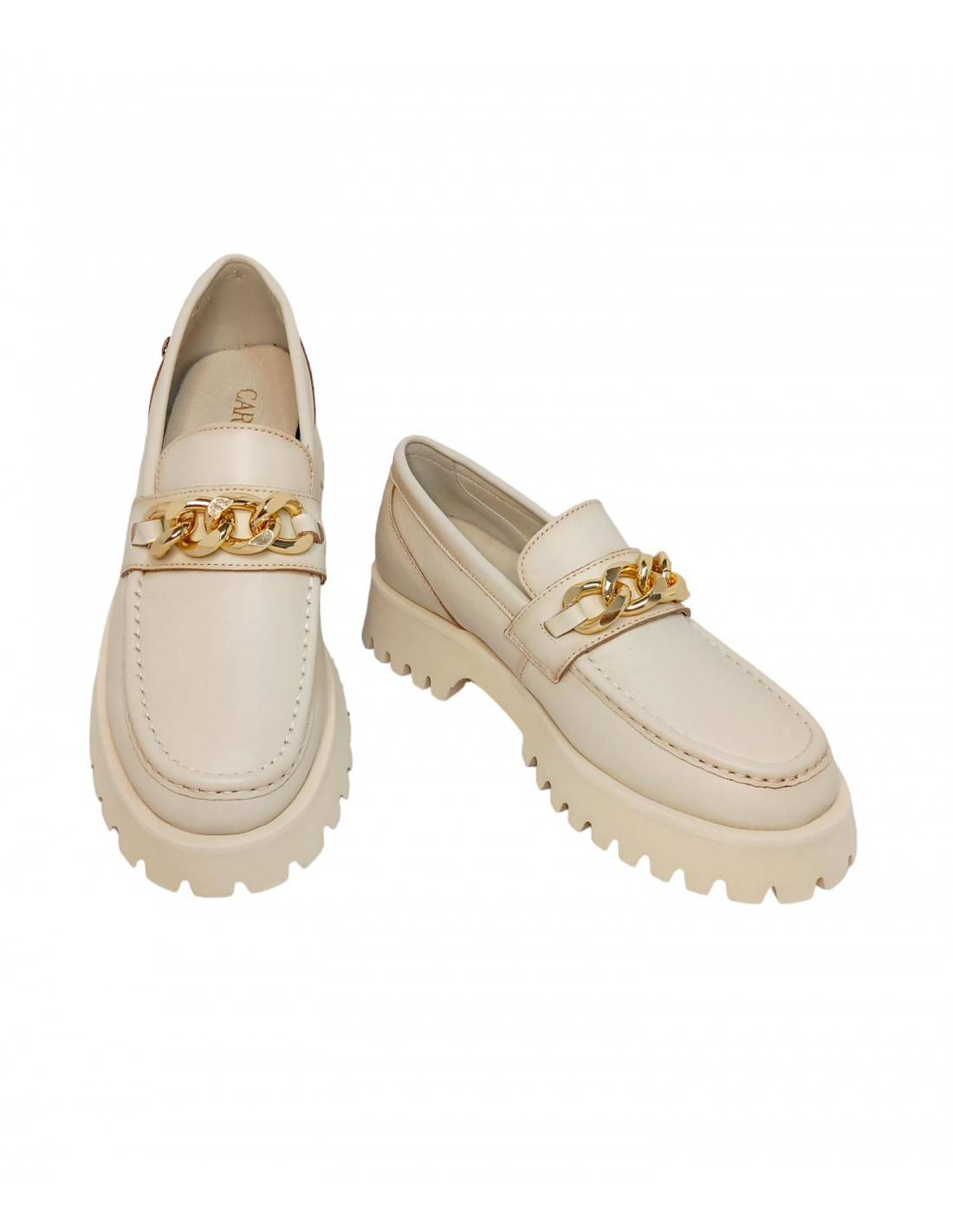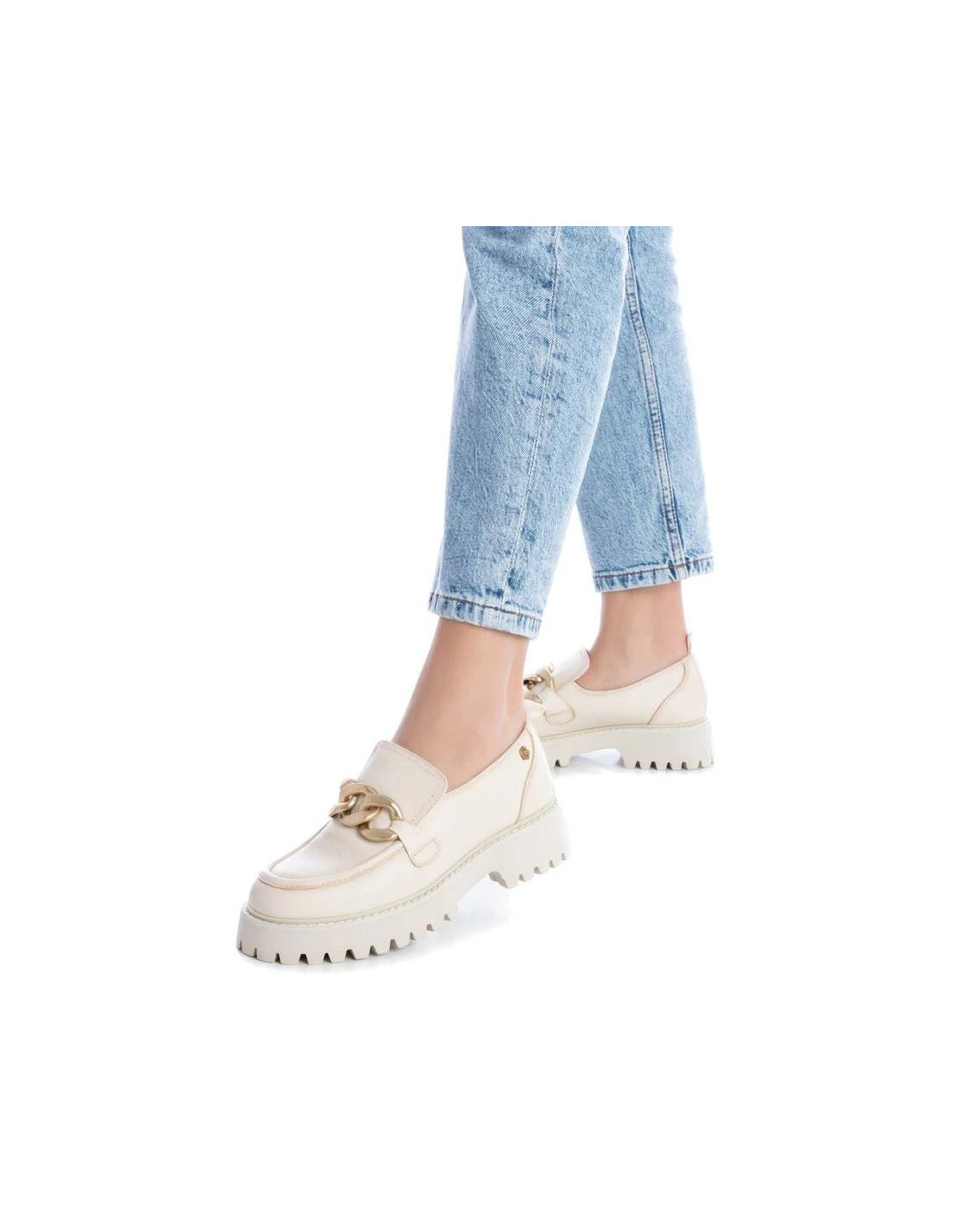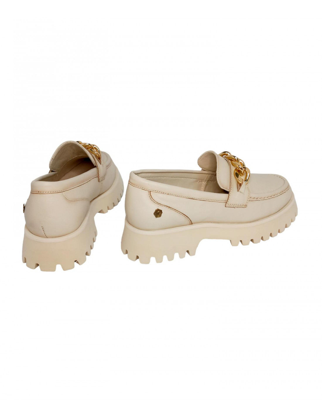 Mocasín fabricado en piel blanda de alta calidad en color hielo. interior en piel y textil con plantilla acolchada, dispone de cadena decorativa en el frontal en tono dorado. Suela dentada antideslizante de tacón ancho de una altura 4 cm y 2,5 cm aprox. parte delantera.