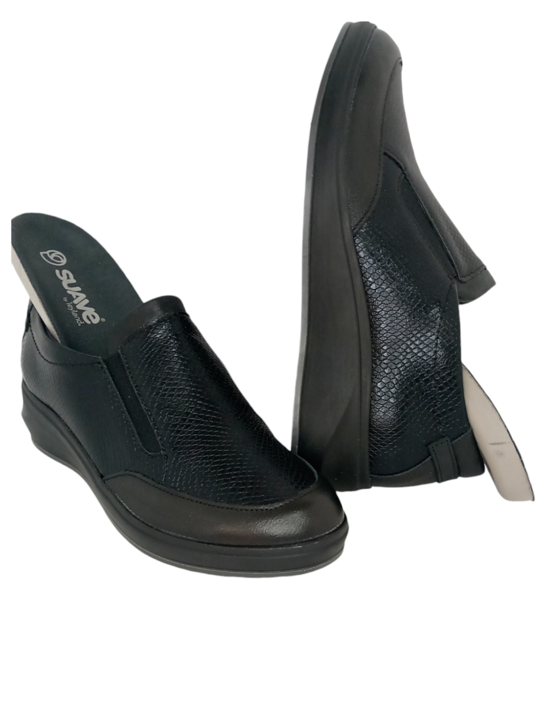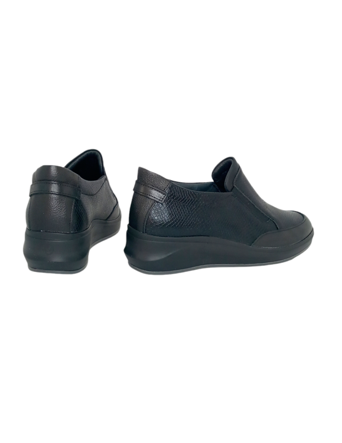 Mocasín fabricado en una combinación de diferentes texturas de piel en color negro. Por su composición es un modelo flexible, resistente y deja una sensación única de confort al contacto con la piel.