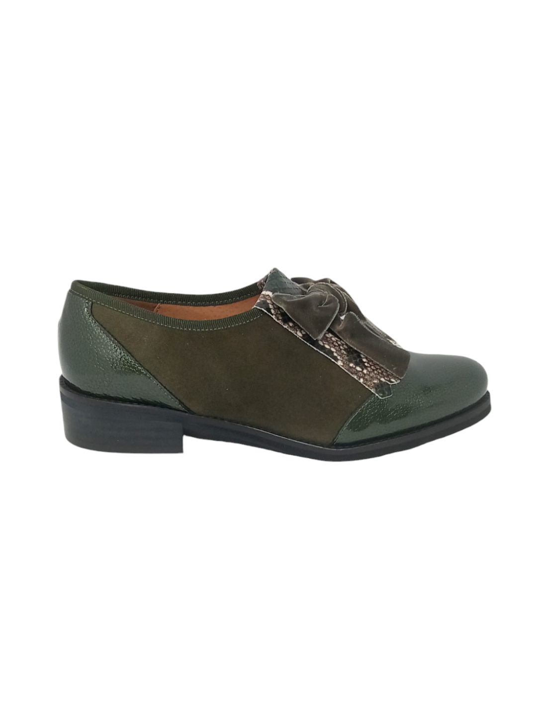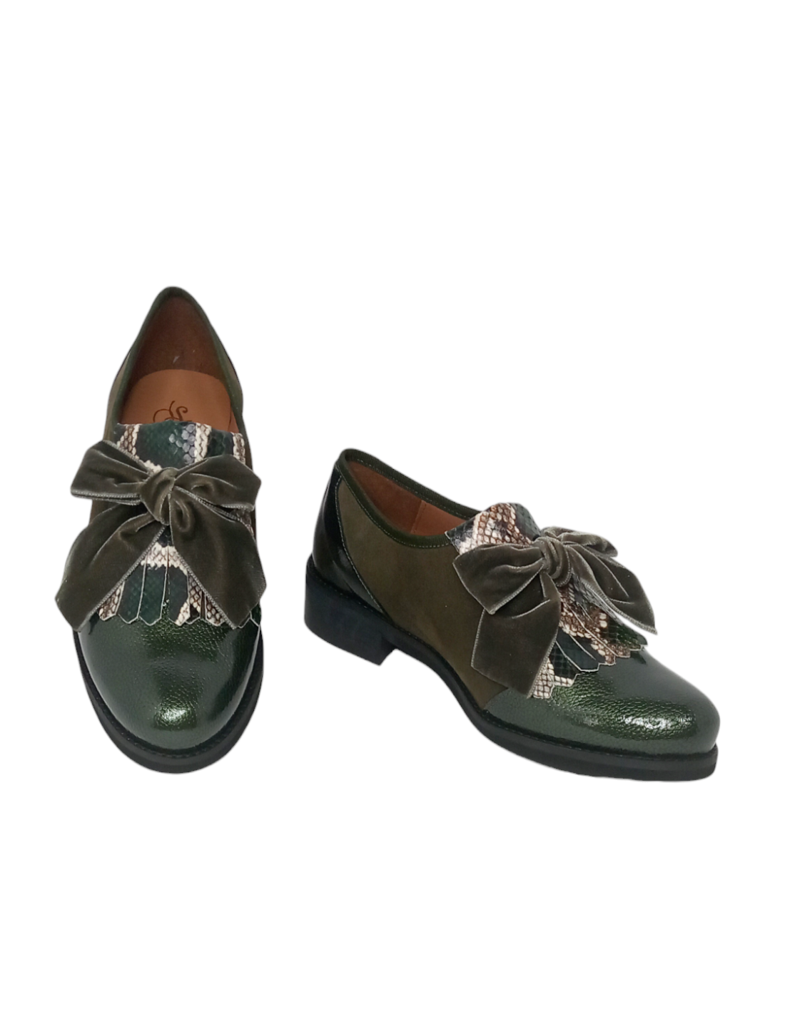Mocasín fabricado en una combinación de diferentes texturas de piel, charol y ante, en color verde, adornado con un lazo de terciopelo al tono en el empeine y flecos de animal print.