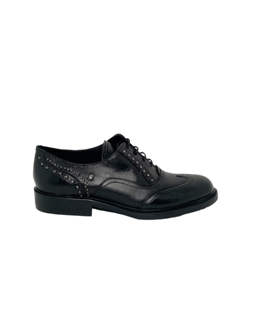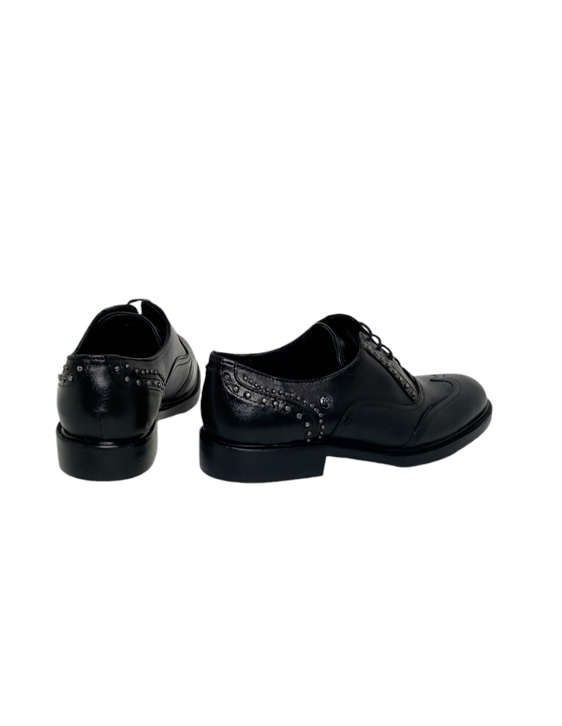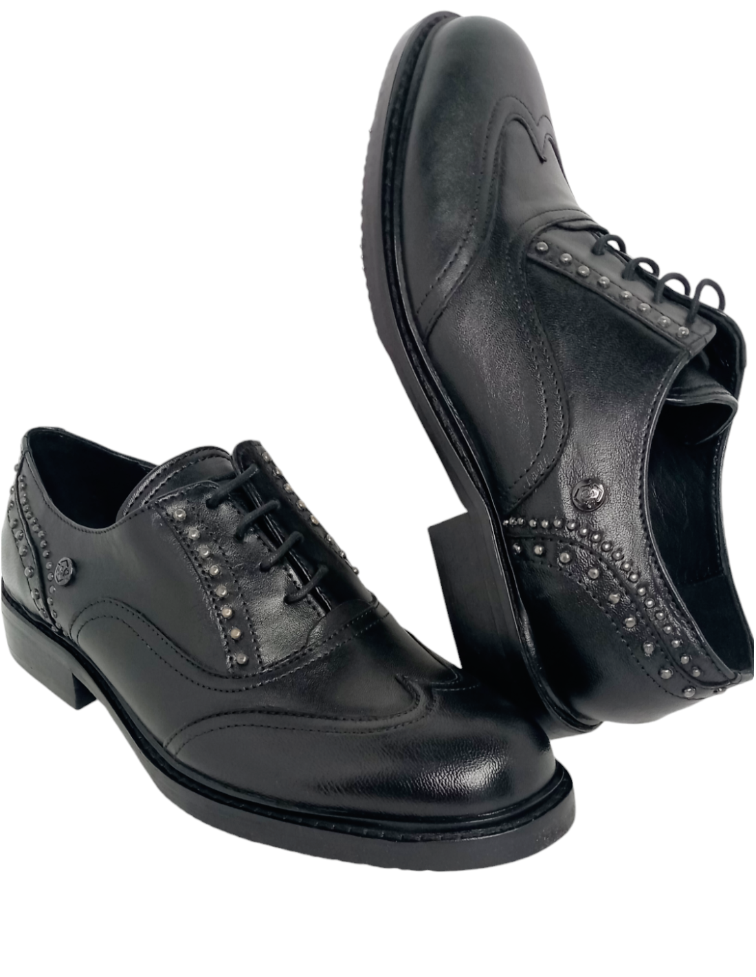 Zapato de cordón tipo oxford, fabricado en piel de primera calidad en color negro, adornado con unas pequeñas tachuelas y la característica forma en la parte delantera de este tipo de zapatos llamada "maría".