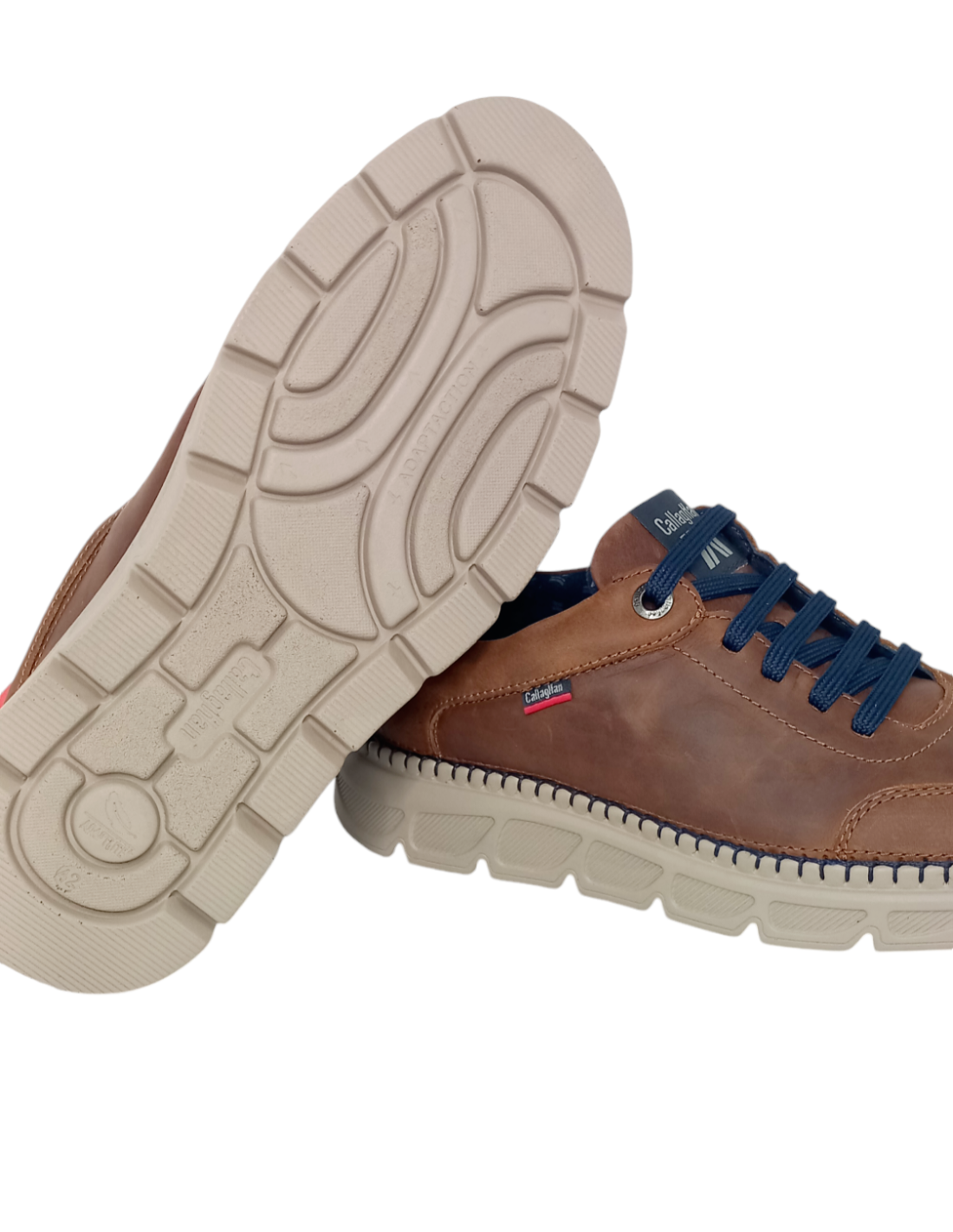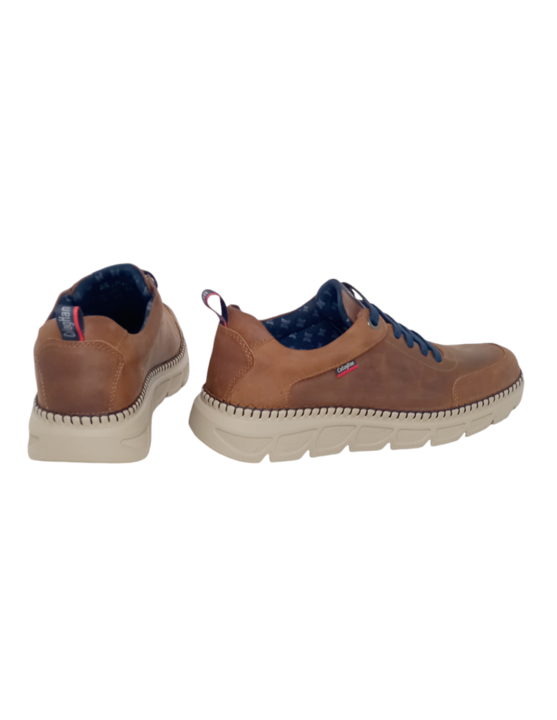 Zapato elaborado con piel nobuck de máxima calidad en color cuero, con detalles como los cordones y un original pespunte visto, situado en la unión con la suela, en azul marino.