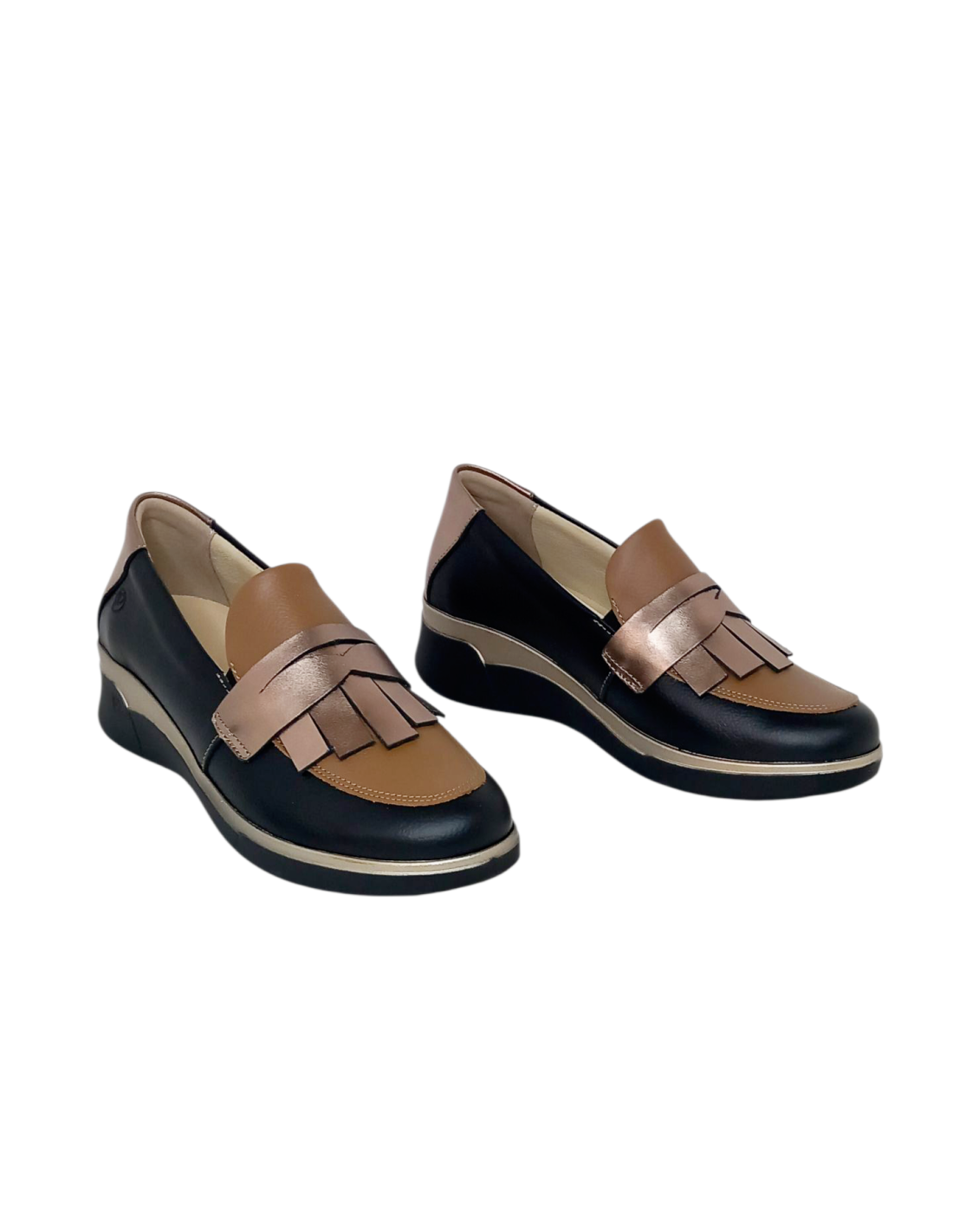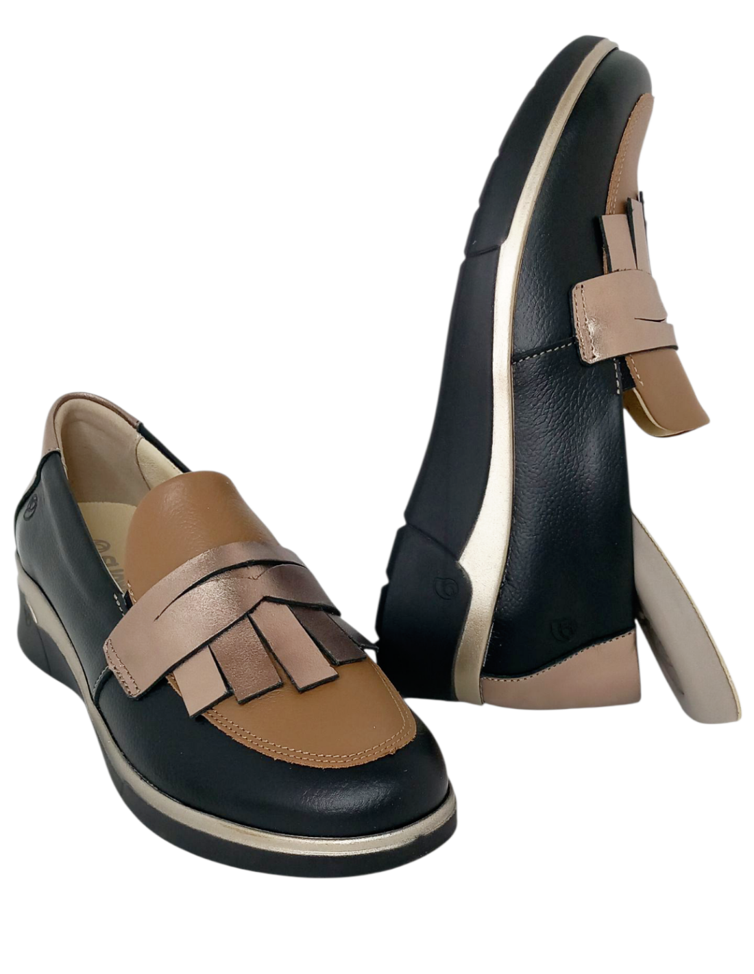 Mocasín fabricado en una combinación de colores súper combinables como son el negro, camel y bronce. Por su composición es un modelo flexible, resistente y deja una sensación única de confort al contacto con la piel.