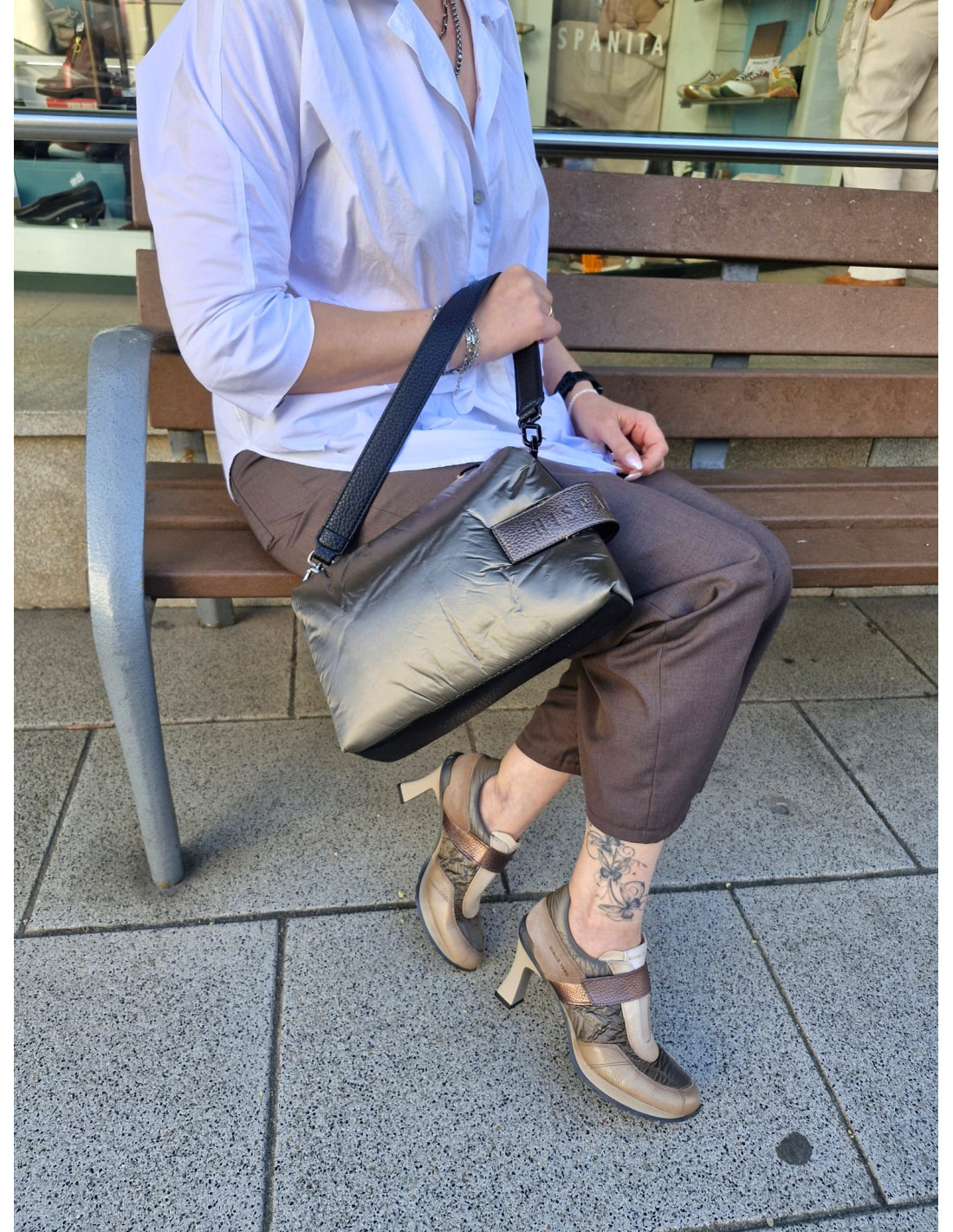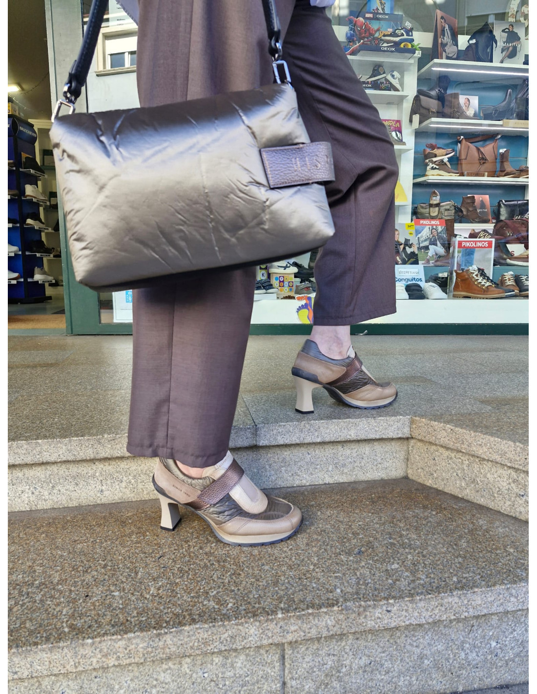 Zapato estilo deportivo abotinado, fabricado en piel combinada con nylon en colores arena y topo, con cierre de velcro y banda elástica en el empeine para favorecer el ajuste del pie.