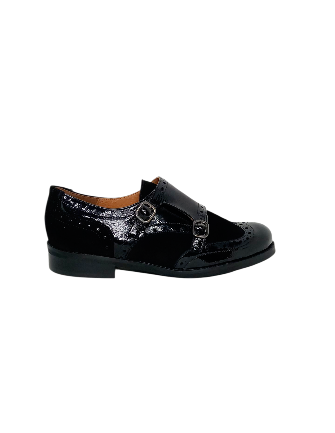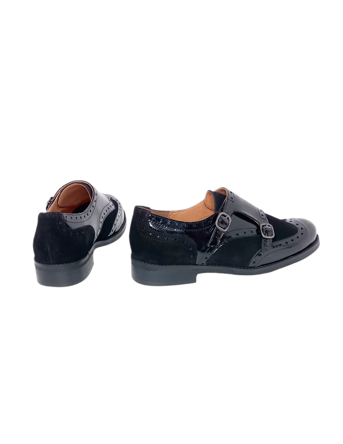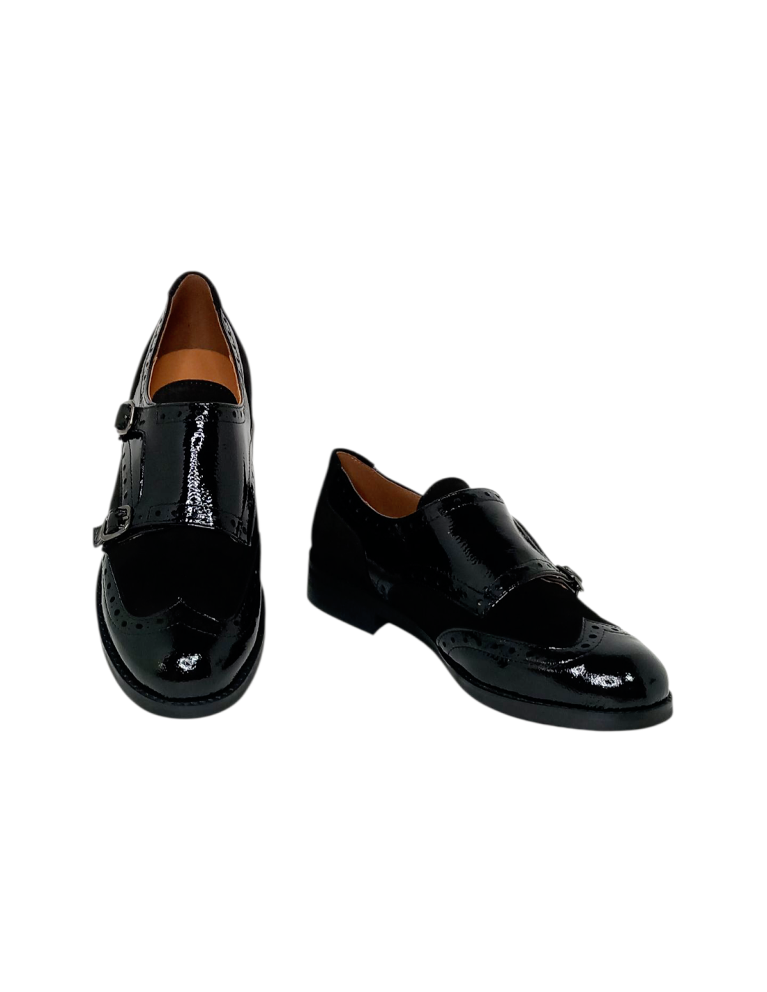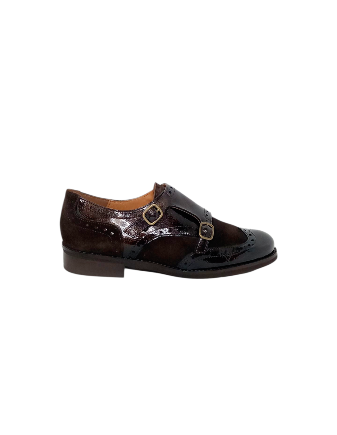 Mocasín fabricado en una combinación de piel charol y serraje en colores marrón y negro, con cierre de dos hebillas en la zona del empeine y ribetes picados.
