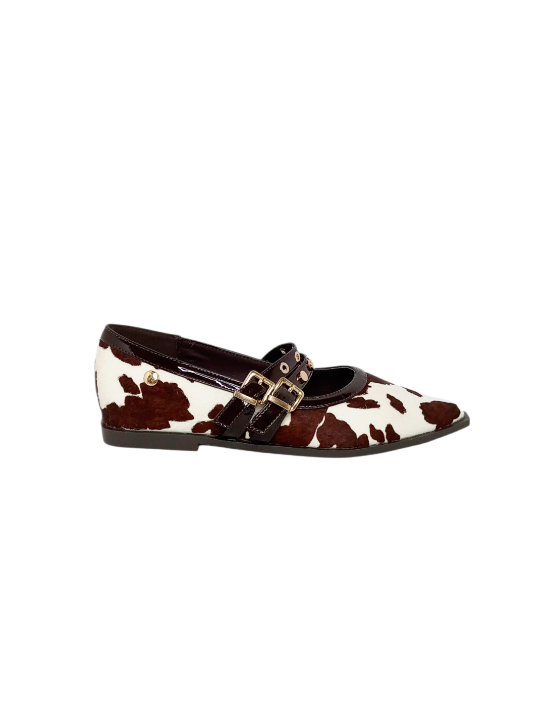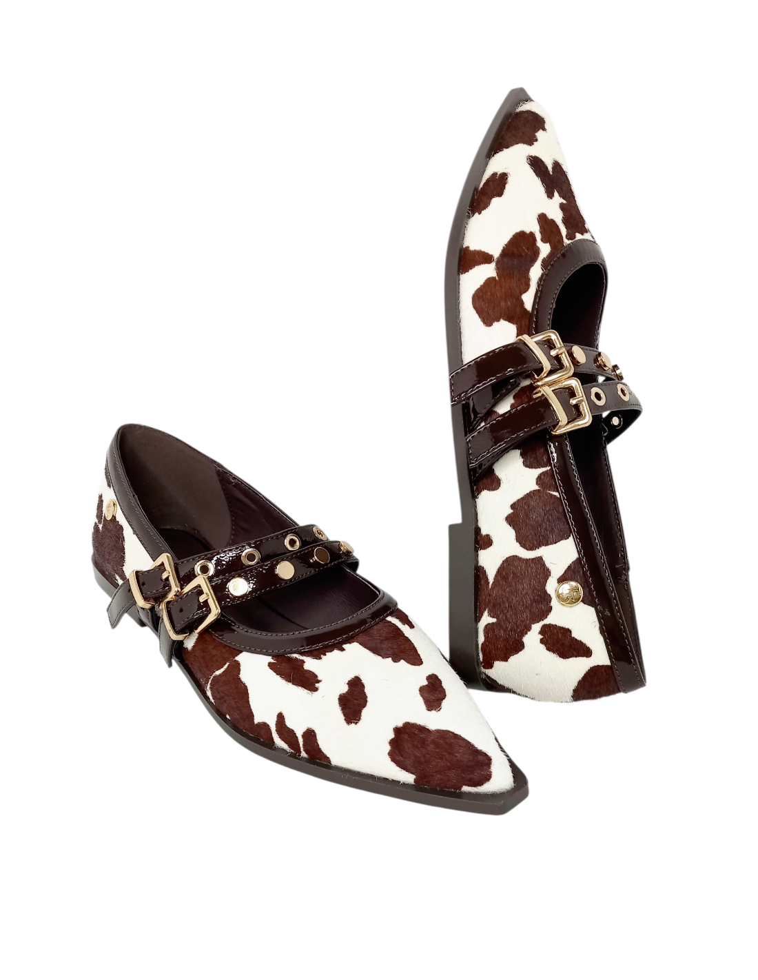 Zapato estilo bailarina fabricado en piel con acabado de pelo de potro y animal print de vaca en colores marrón y blanco