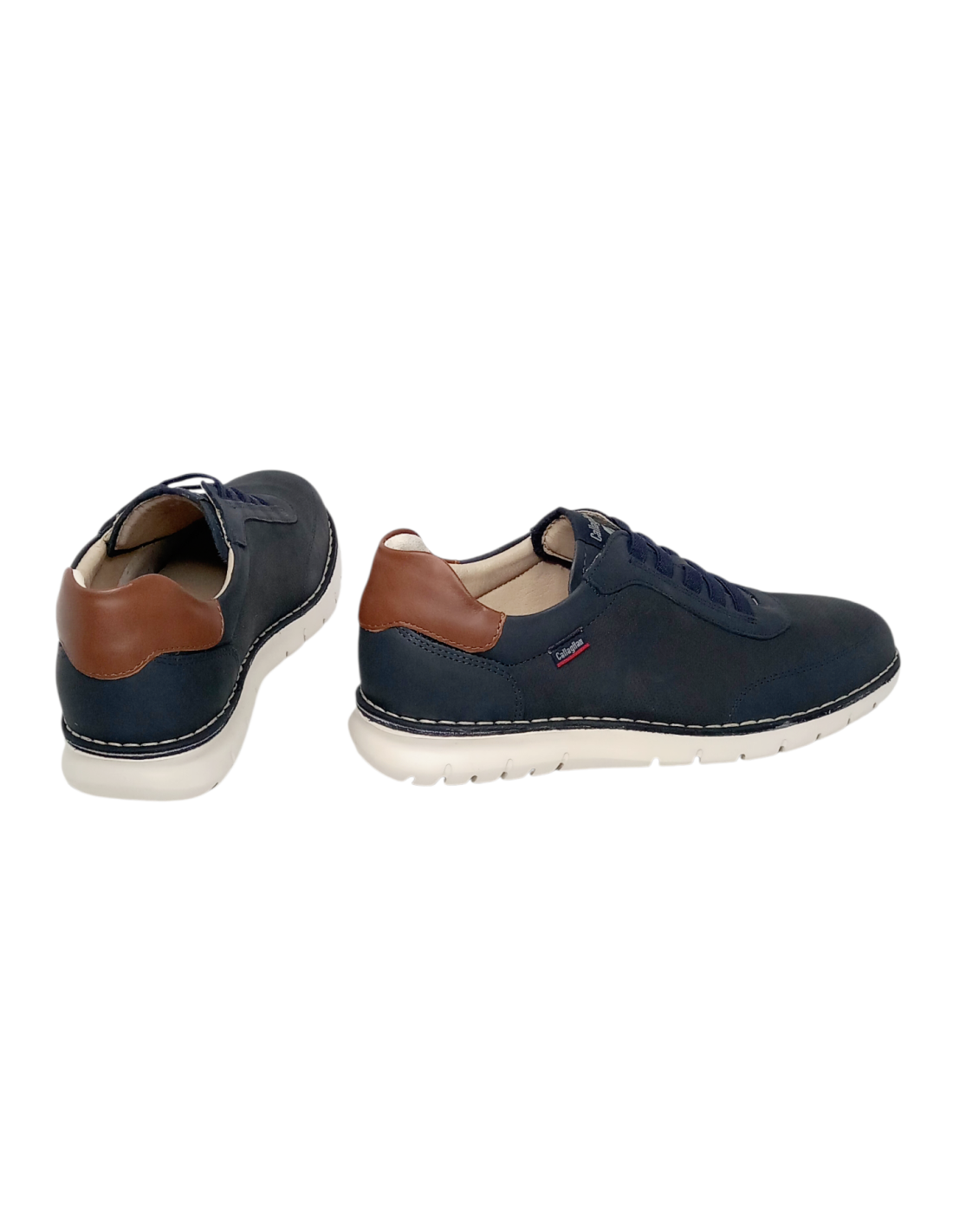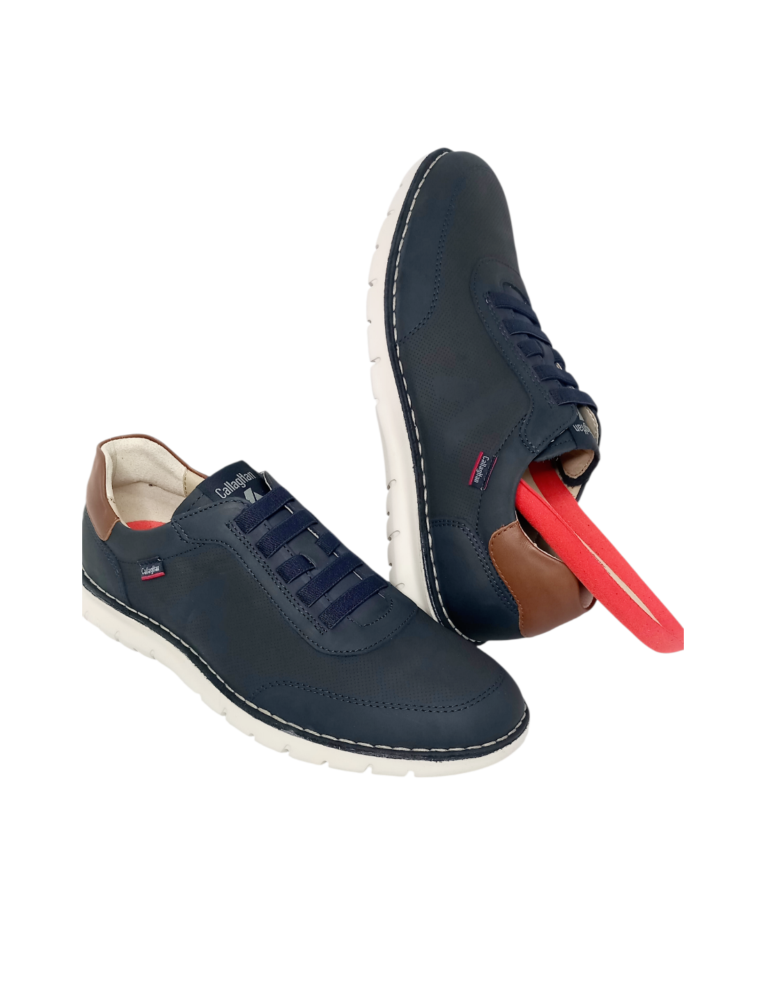 Zapato de estilo sport elaborado con piel nobuk de colores cuero y azul marino. Cuenta con una talonera forrada en piel color cuero, de gran adaptabilidad.