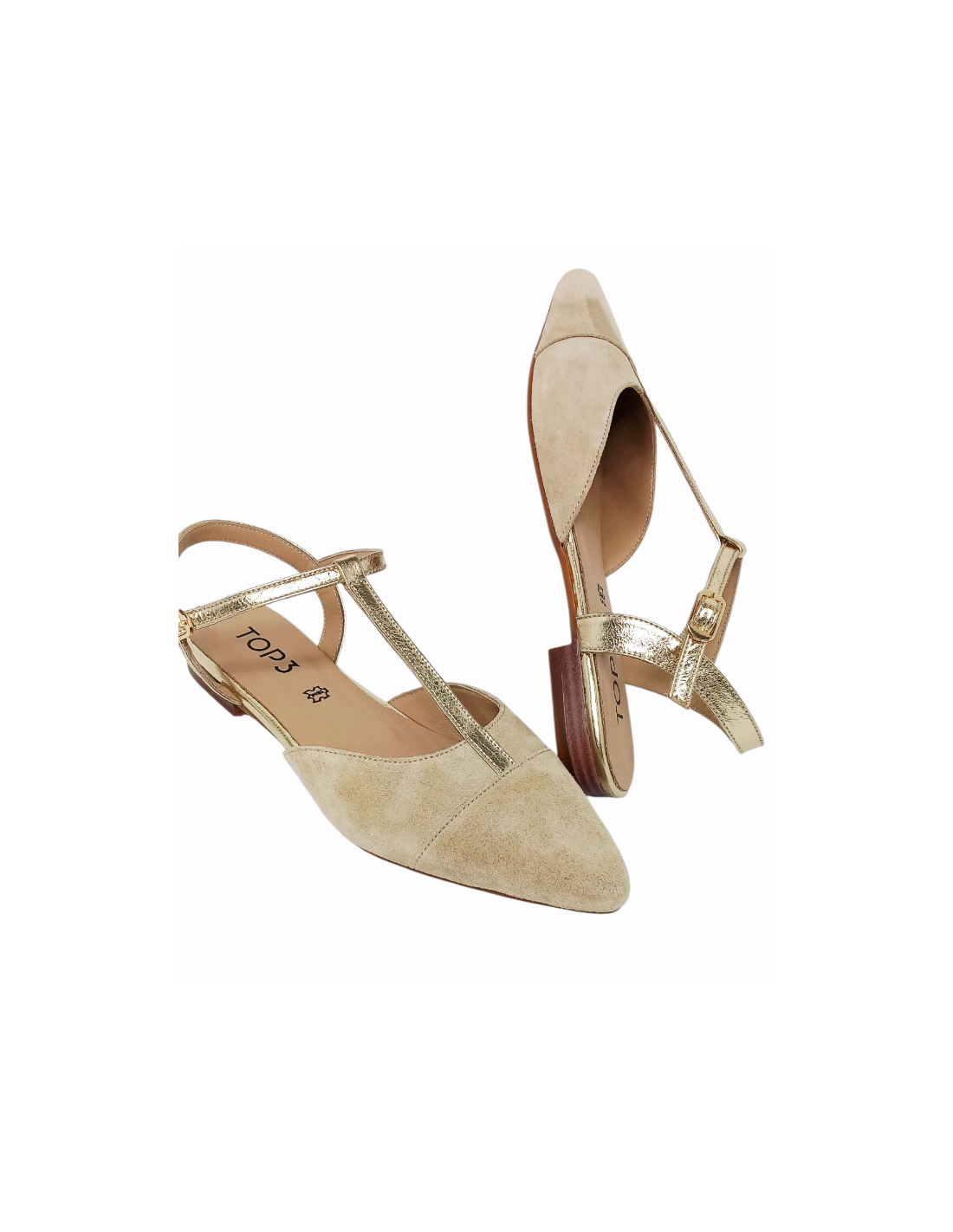 Zapato estilo bailarina destalonado fabricado en piel color arena y oro.