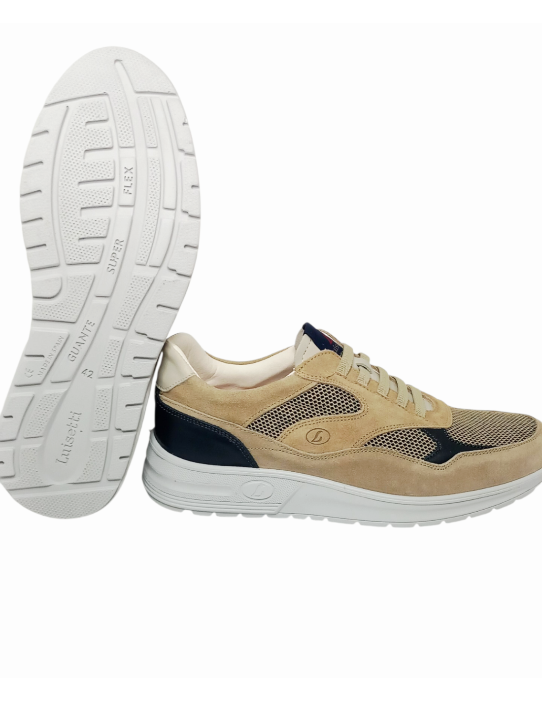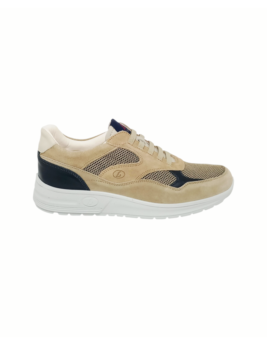 Zapato casual de horma ancha en color beige con detalles en azul marino.