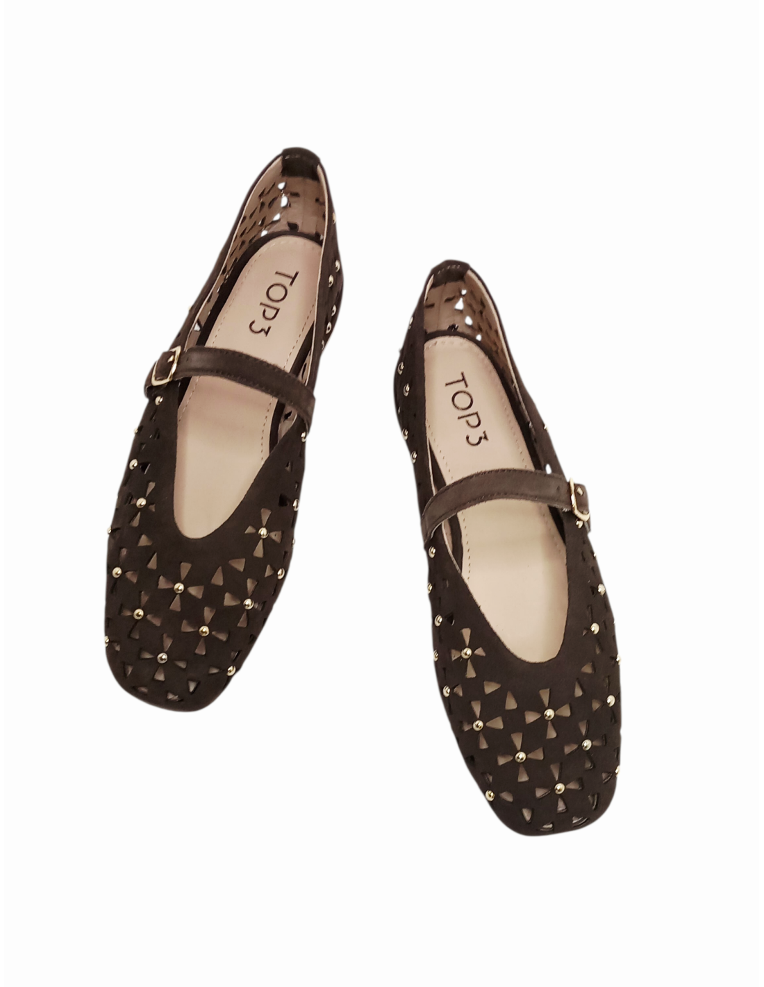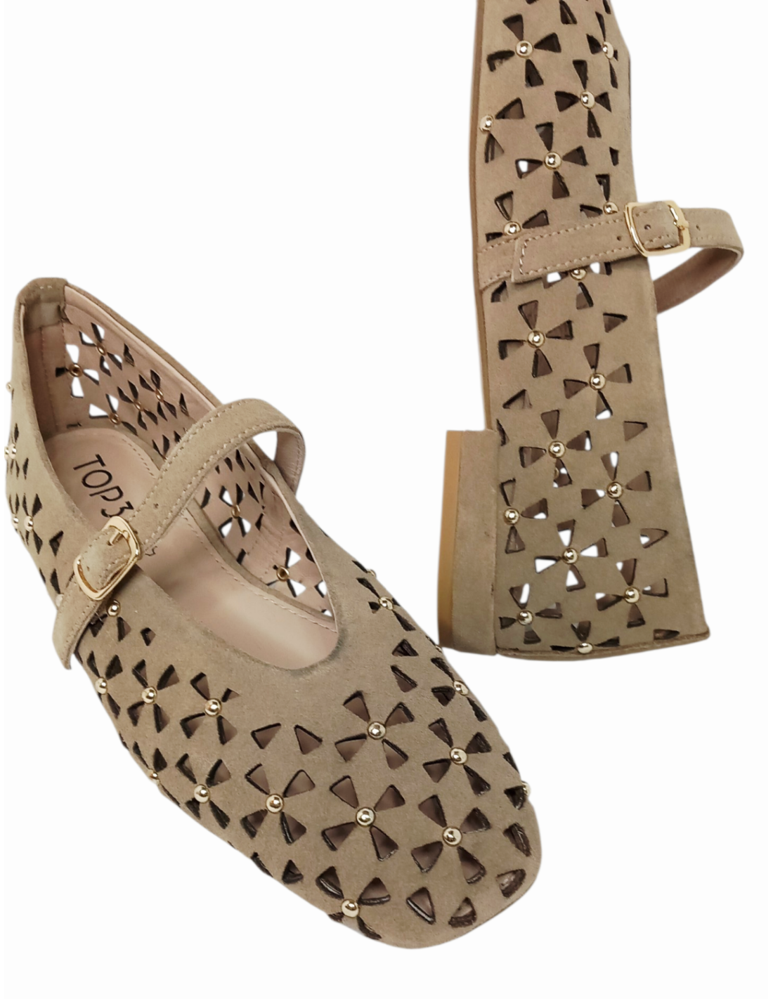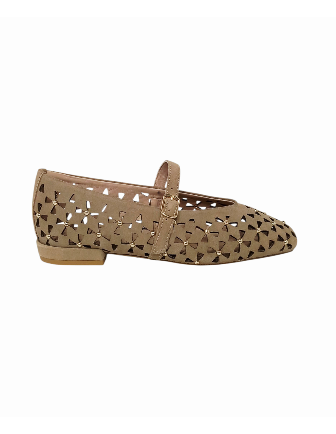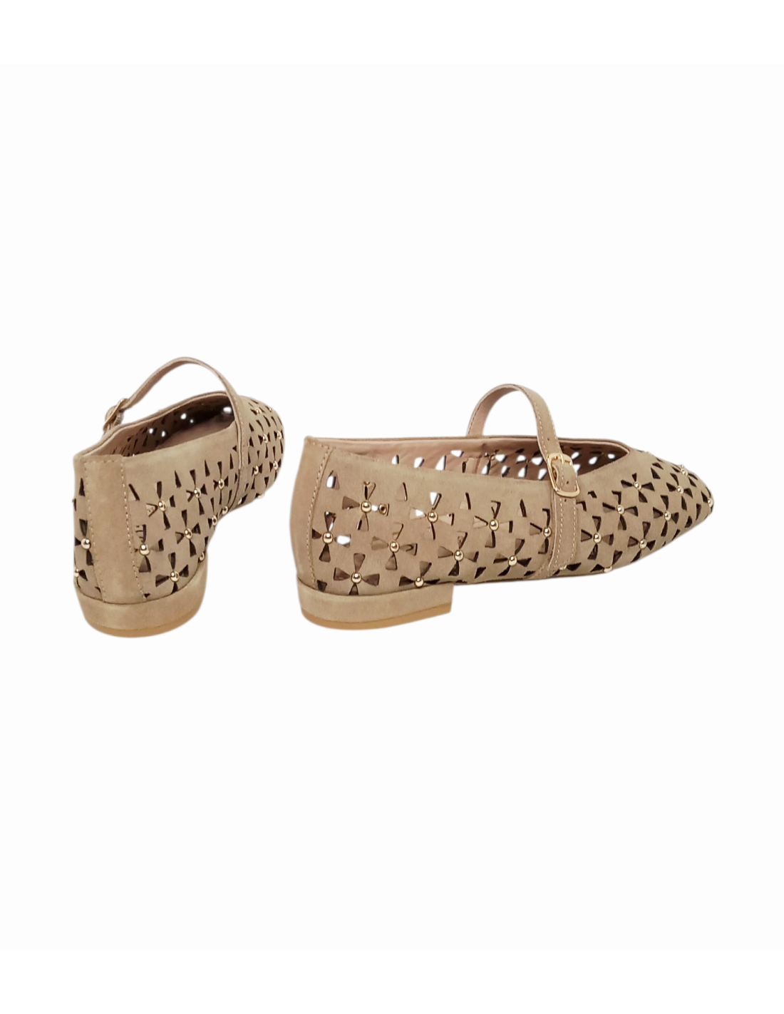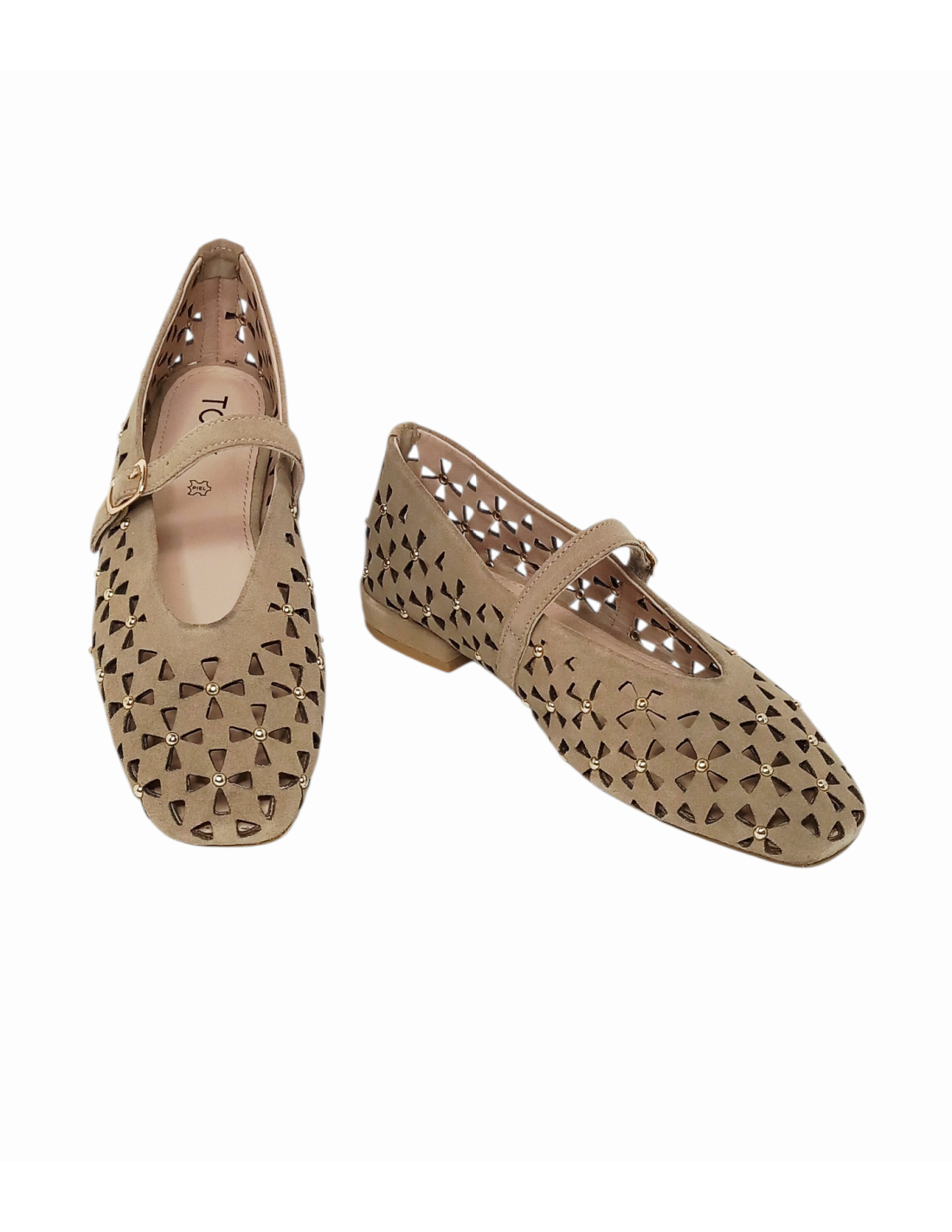 Zapato estilo bailarina fabricado en piel serraje troquelada en colores marrón y beige, adornada con pequeñas tachuelas.