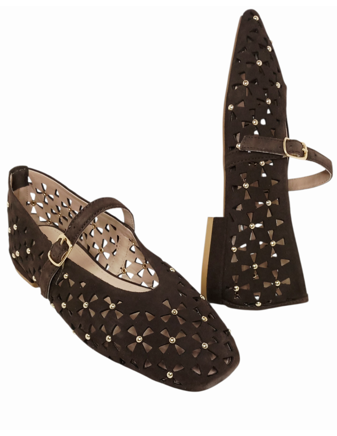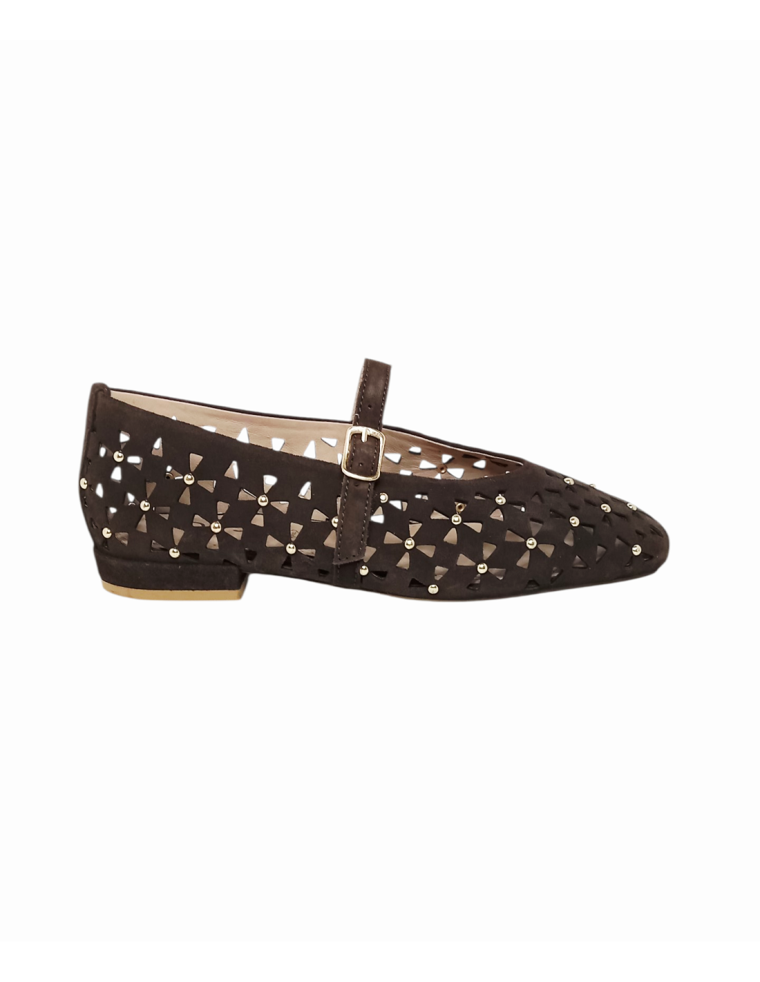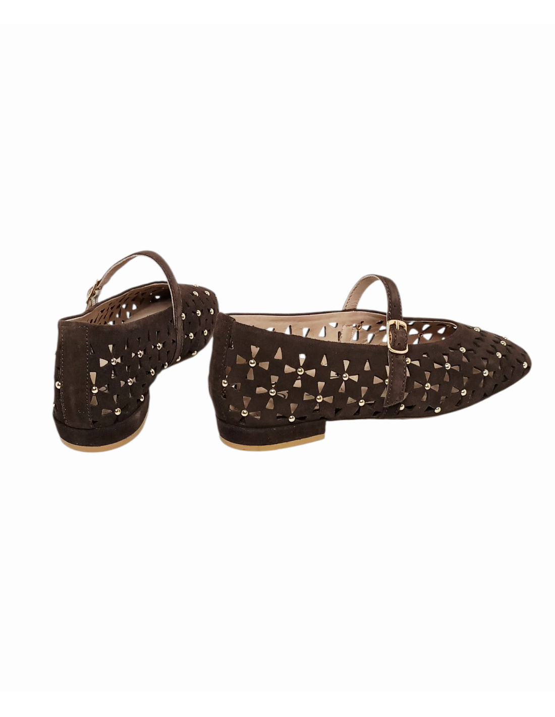 Zapato estilo bailarina fabricado en piel serraje troquelada en colores marrón y beige, adornada con pequeñas tachuelas.
