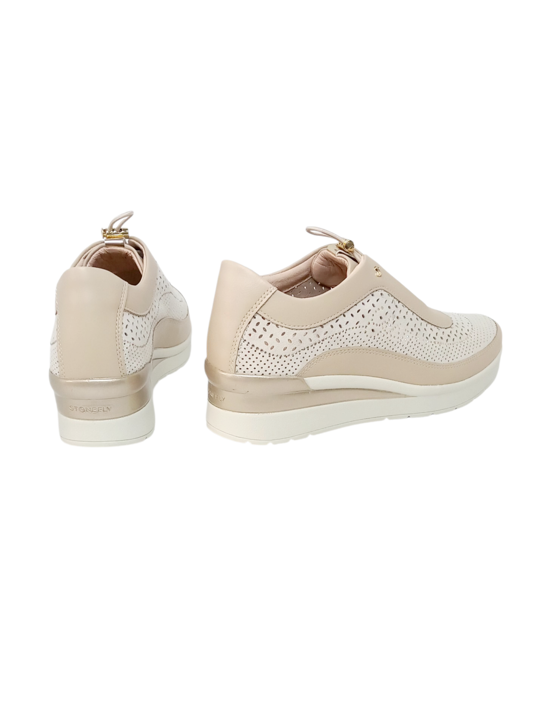 Zapato estilo deportivo fabricado en piel calada en una mezcla de tonos beige y dorado.
