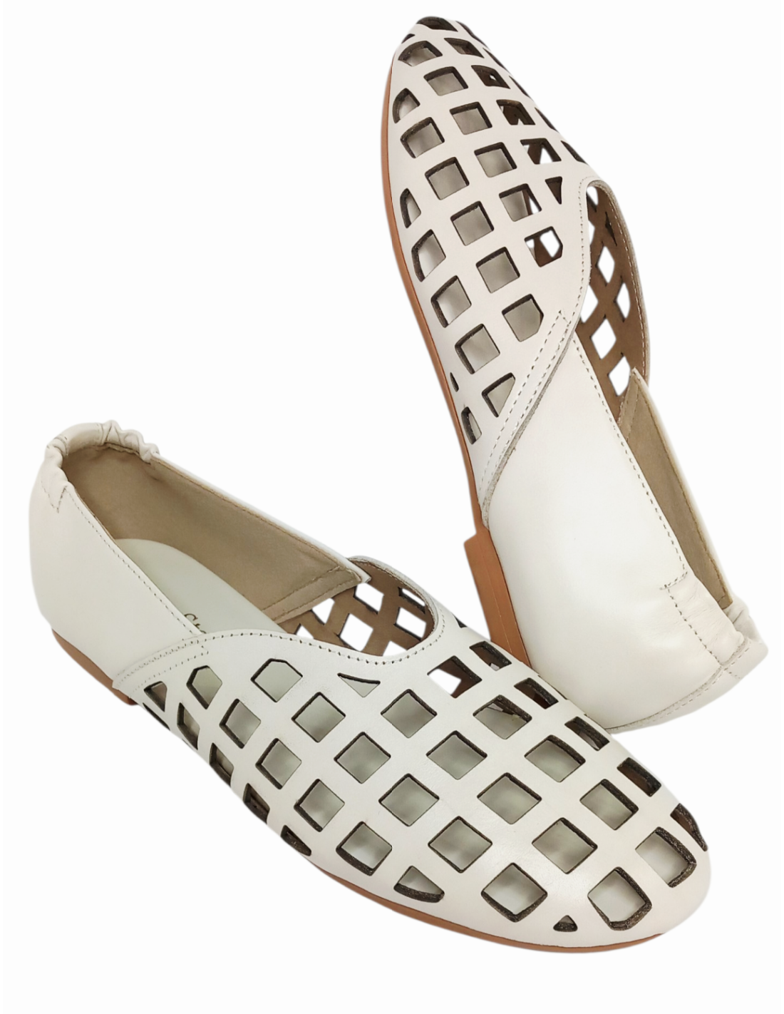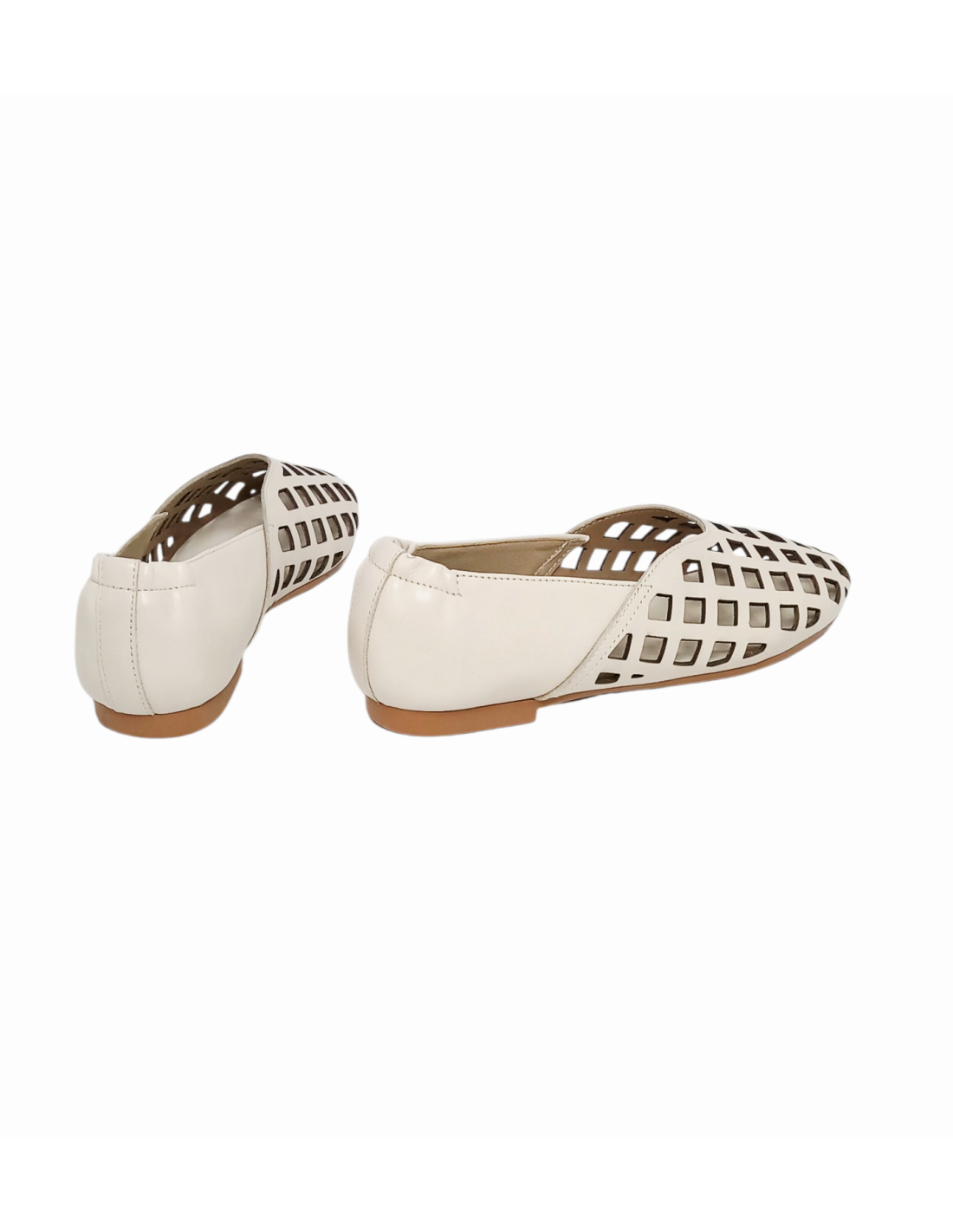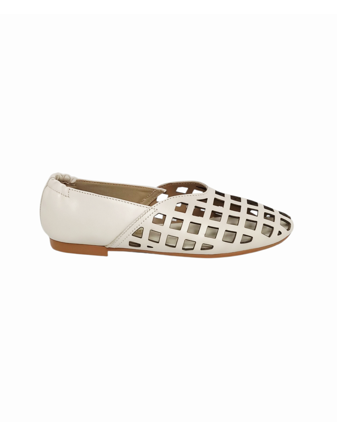 Zapato estilo bailarina fabricado en piel calada en forma de rejilla de colores marrón chocolate y blanco roto. Es un diseño súper tendencia confeccionado con materiales de primera calidad.