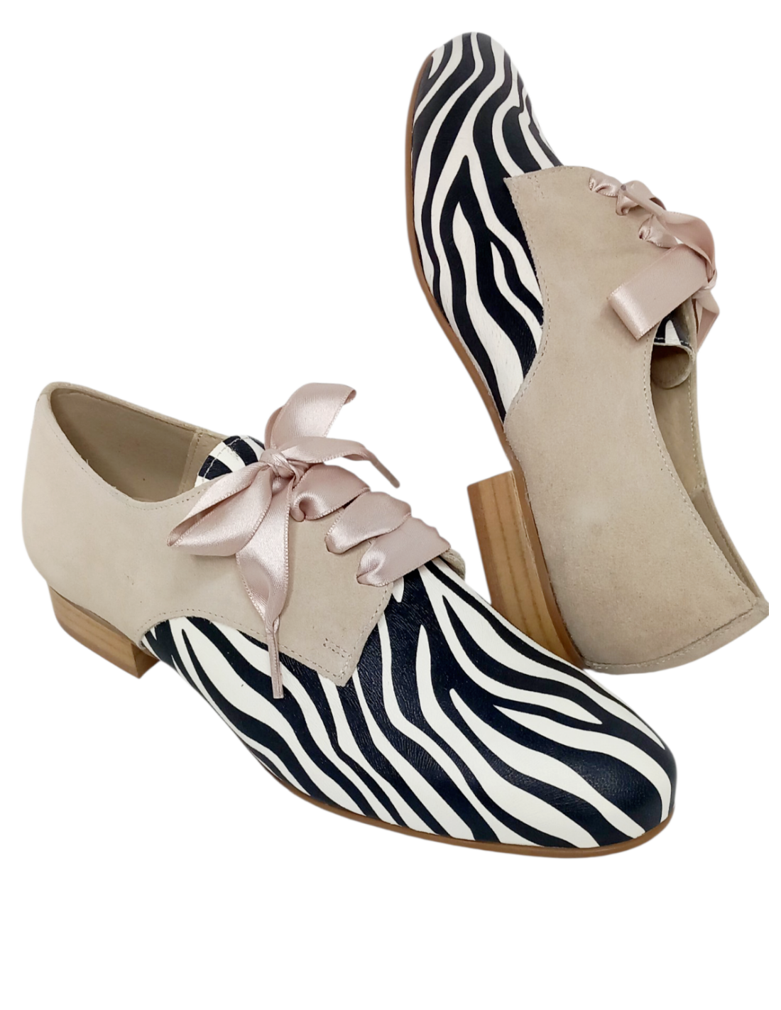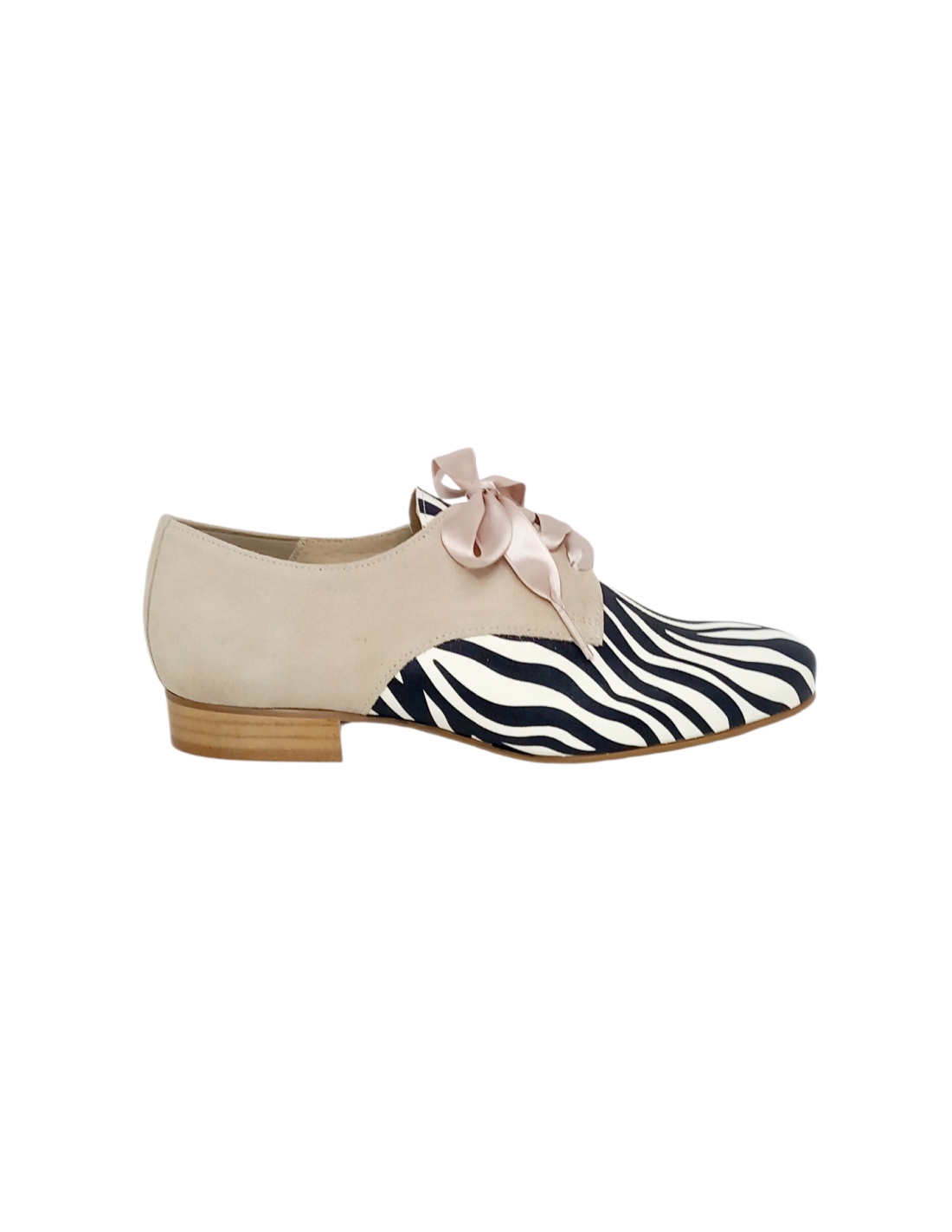 Zapato de estilo casual fabricado en piel de primera calidad de dos texturas distintas, serraje beige y animal print de cebra.