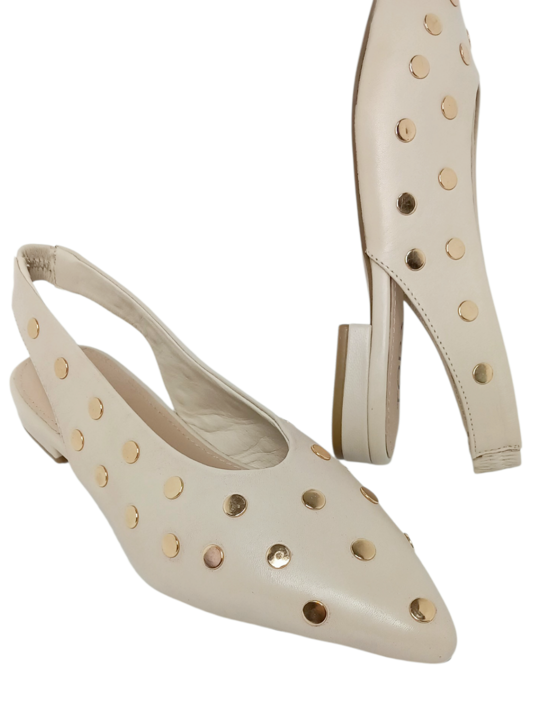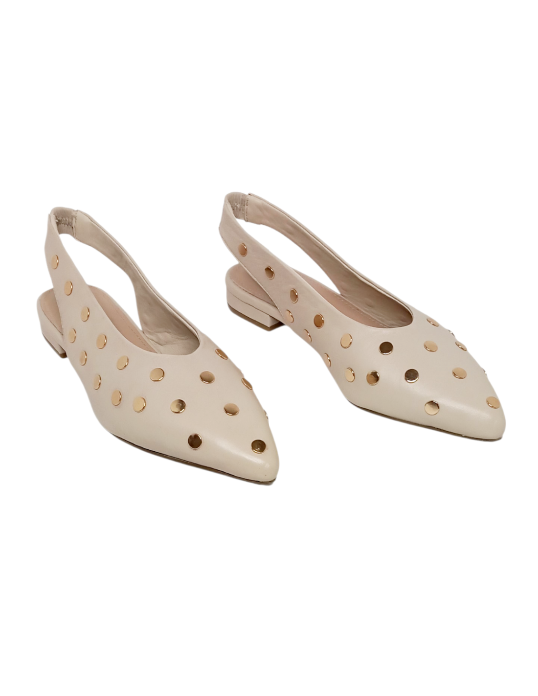 Zapato estilo bailarina destalonado fabricado en piel color negro adornado con tachuelas plateadas circulares y en color beige con tachuelas doradas. Estiliza mucho gracias a su escote redondo y la forma en punta.