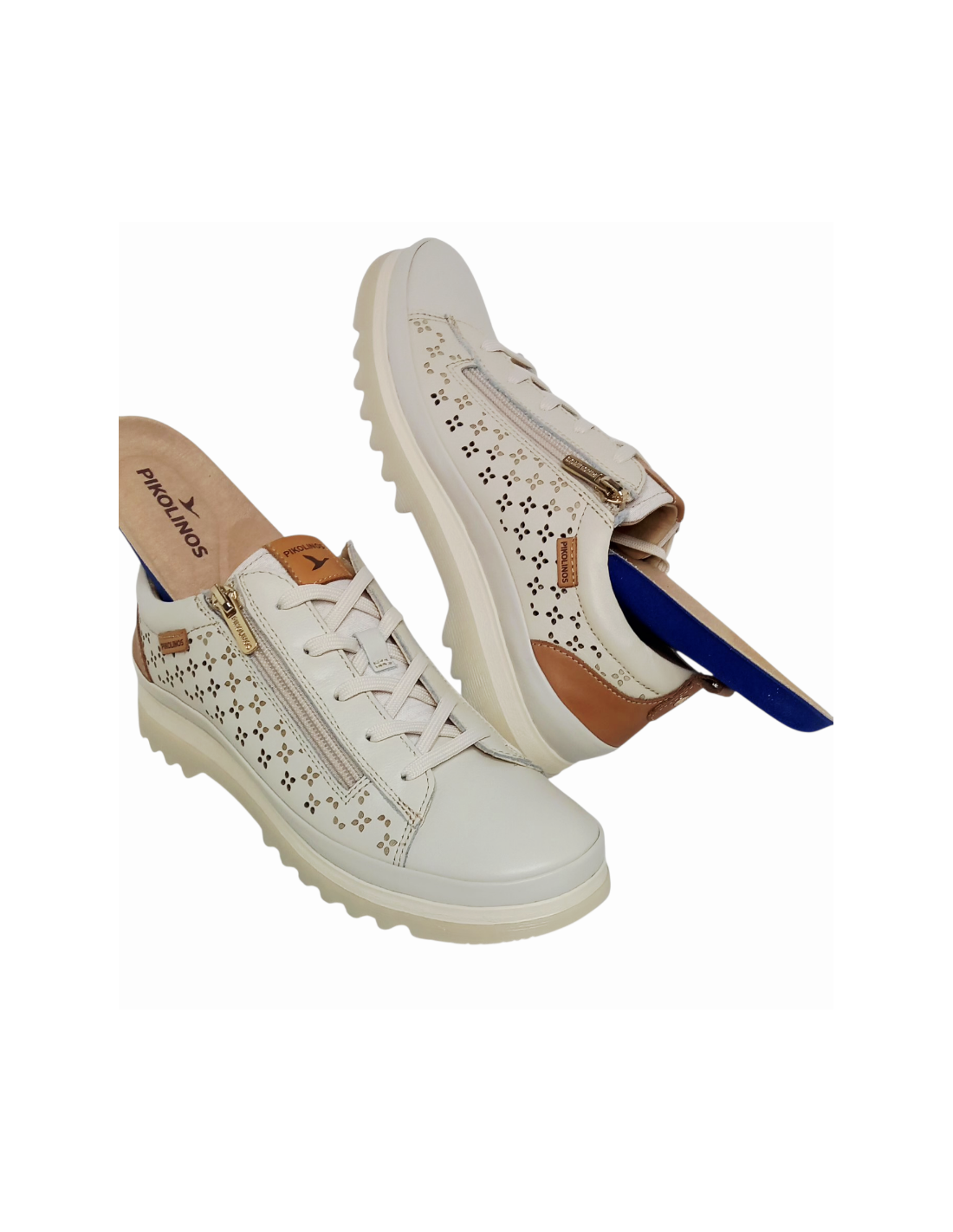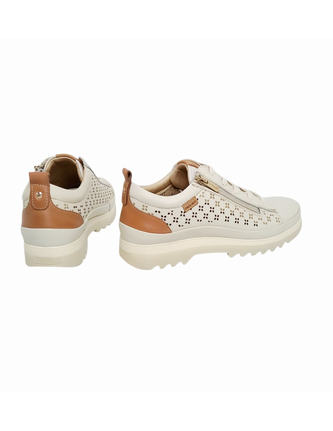 Zapato de estilo casual fabricado con piel vacuna de color nata con calados geométricos en los laterales que aportan frescura y diseño.