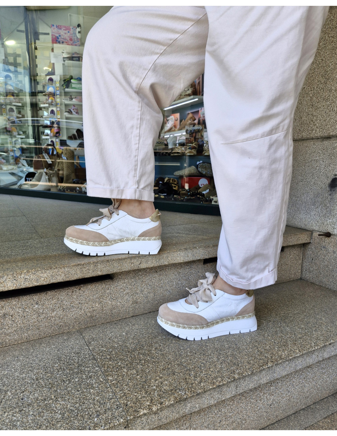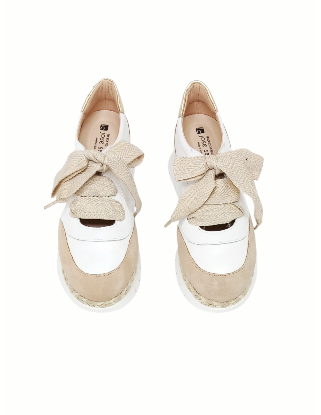 Zapato de estilo casual fabricado en piel de diferentes texturas combinando los colores blanco y beige, adornado además con un ribete de rafia en la unión con la suela muy original.