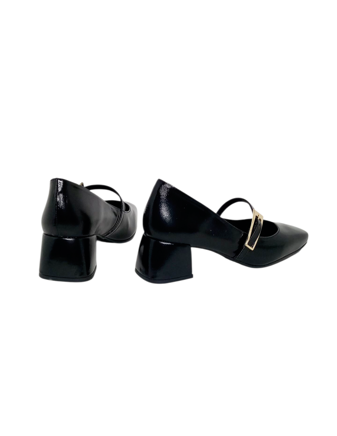 Zapato estilo Mary Jane en charol de color negro con pulserita con cierre de hebilla ajustable en el mismo tono.
