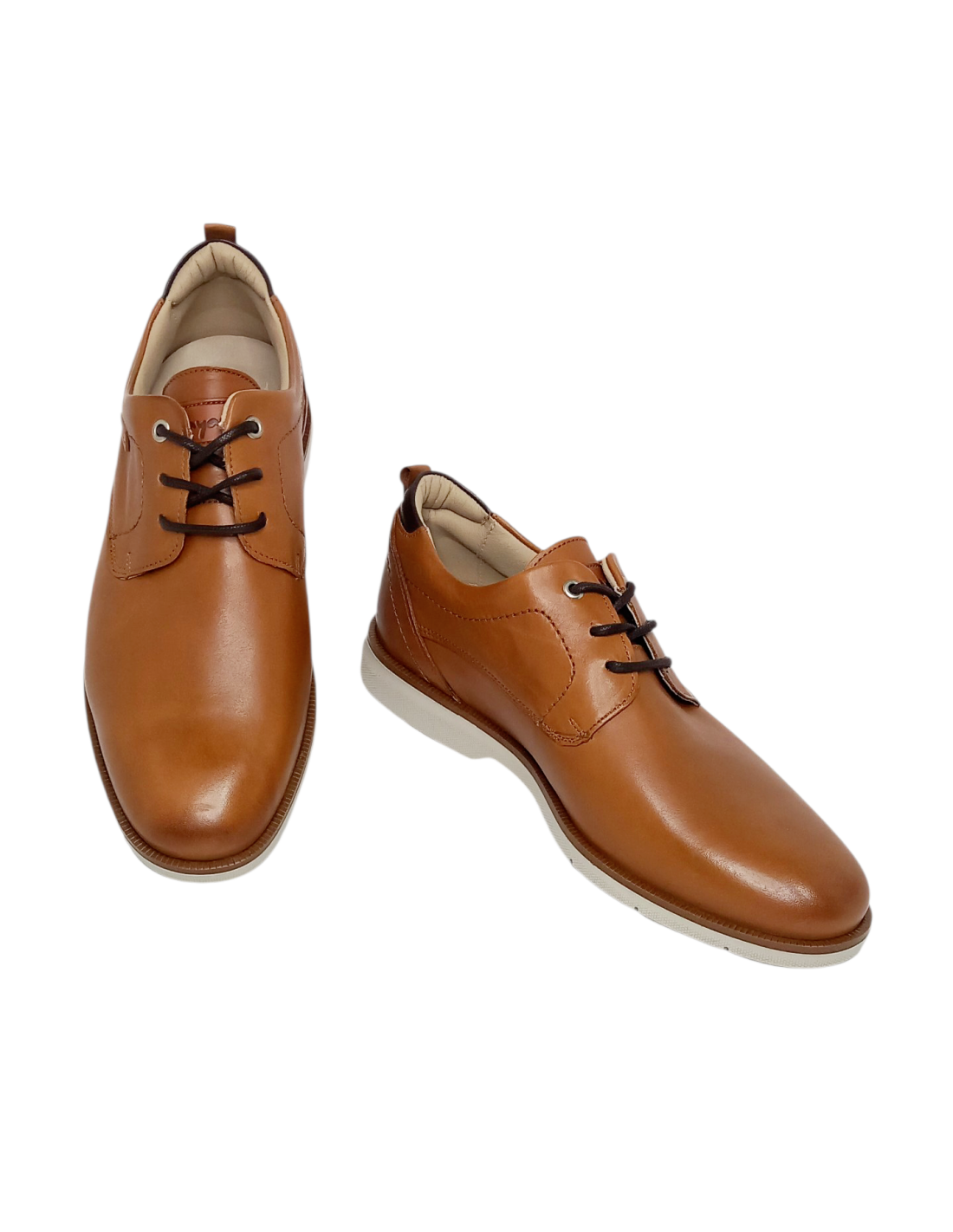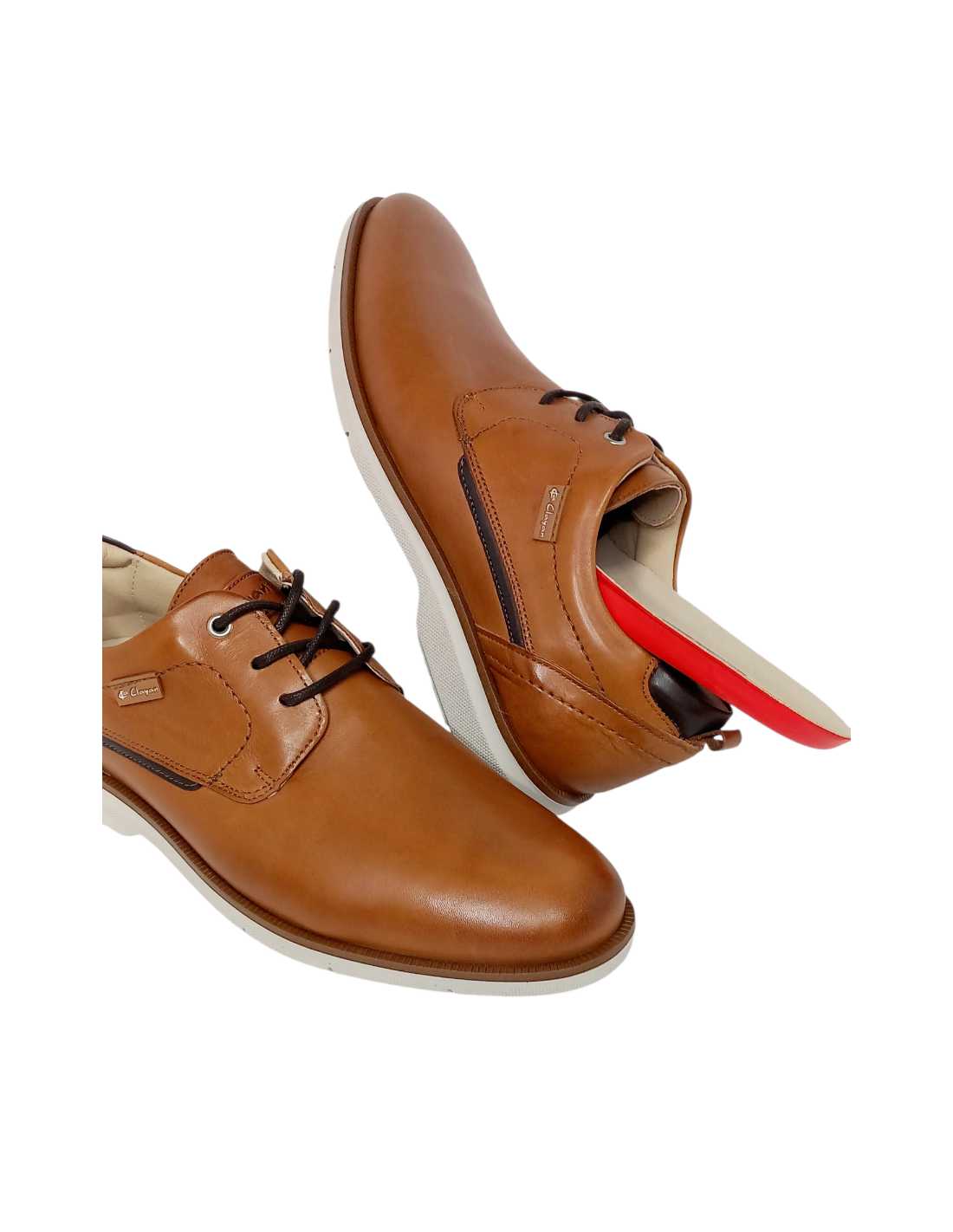 Zapato fabricado en piel en colores azul marino y cuero con detalles haciendo contraste de color en la talonera, el lateral y la suela.