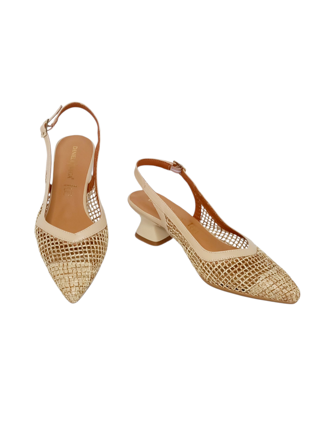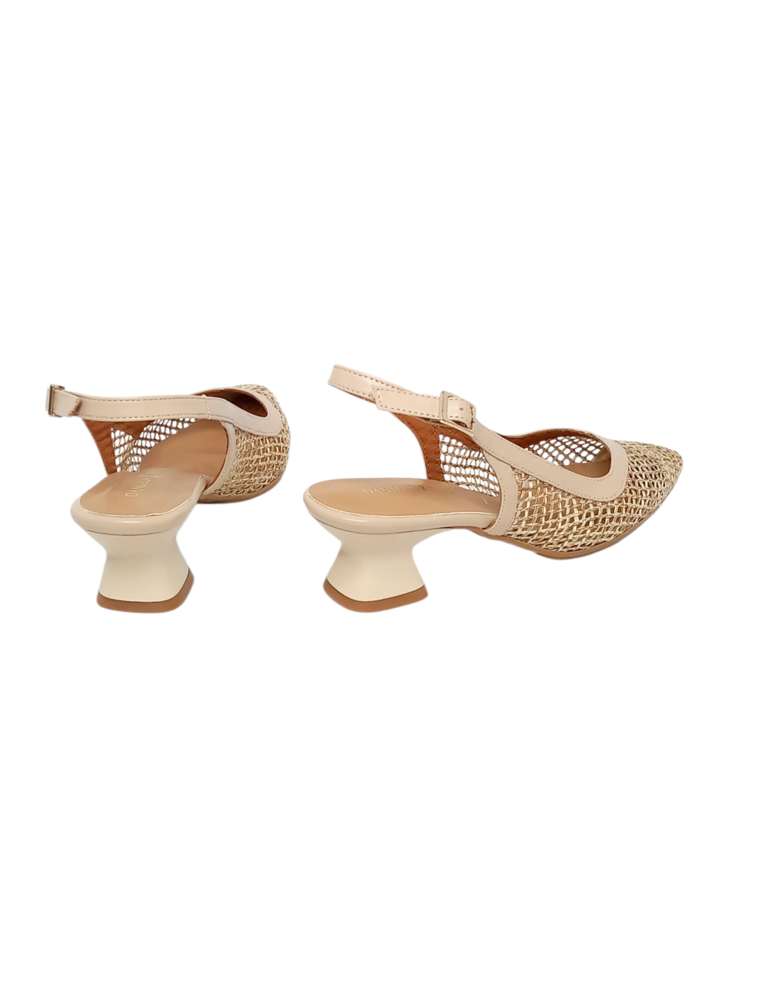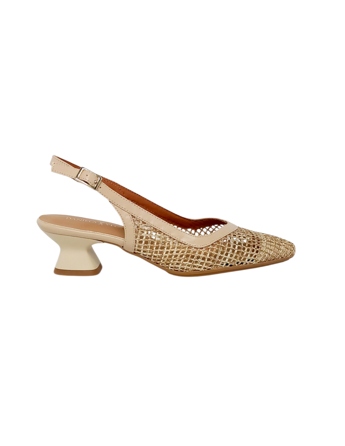 Zapato de vestir enrejado para mujer, corte salón destalonado en color natural.