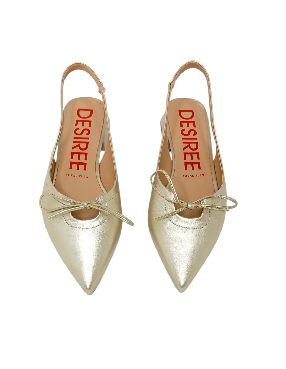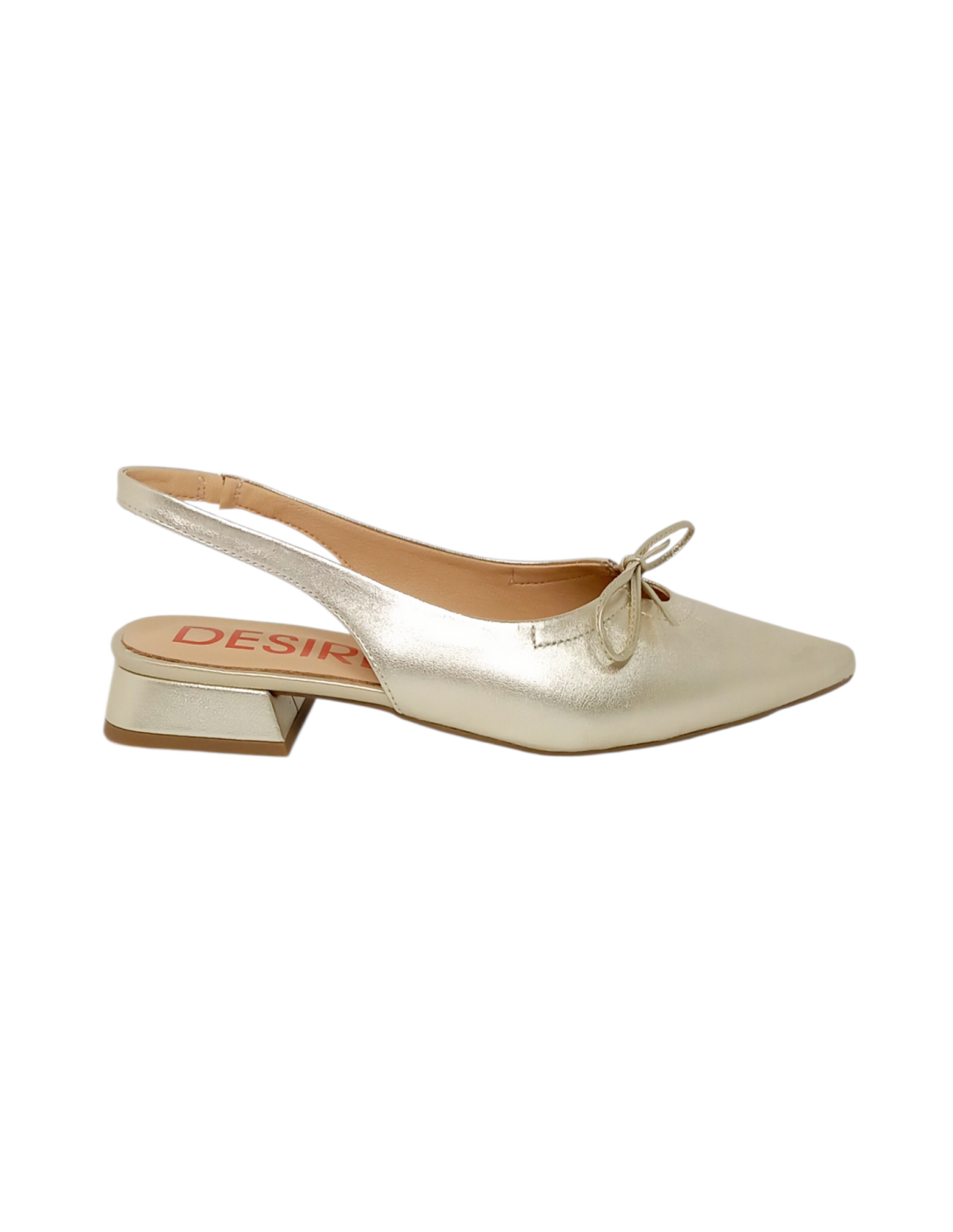 Zapato corte salón destalonado fabricado en piel metalizada de color oro champán adornado con una lazada fina en el empeine.