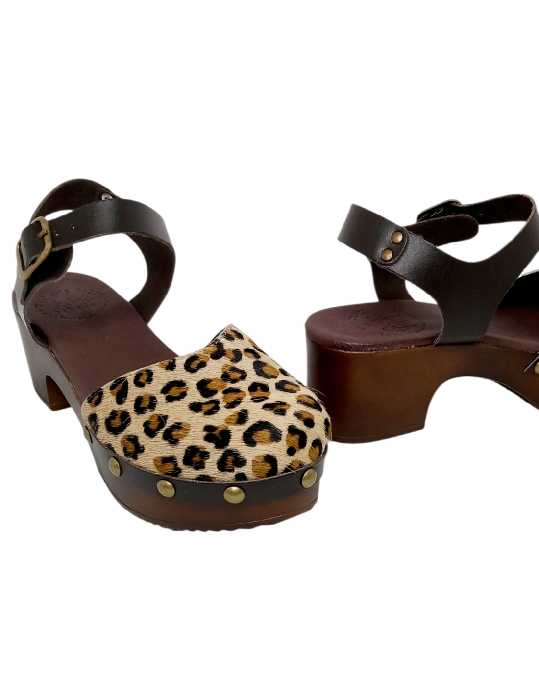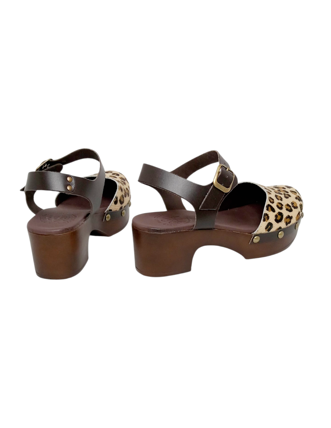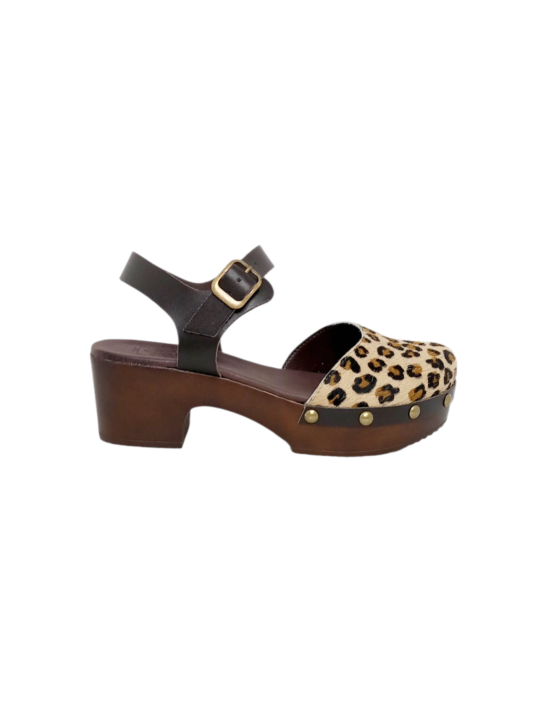 Zueco fabricado en piel con acabado pelo de potro de animal print de leopardo, además de tachuelas en la unión con la suela.