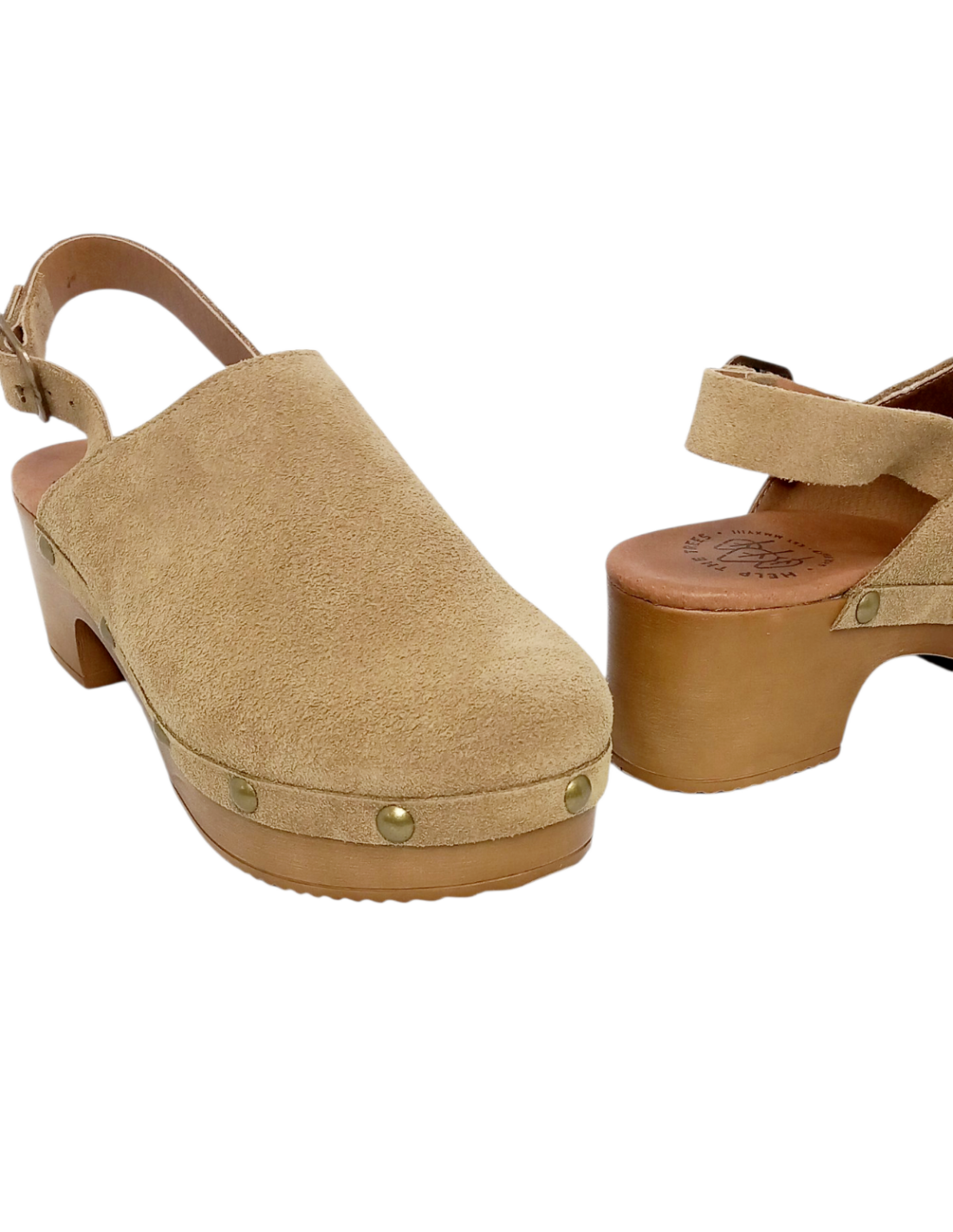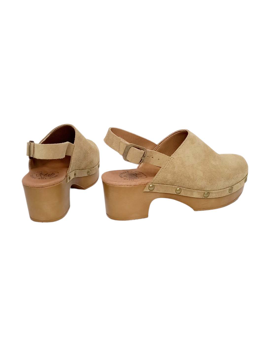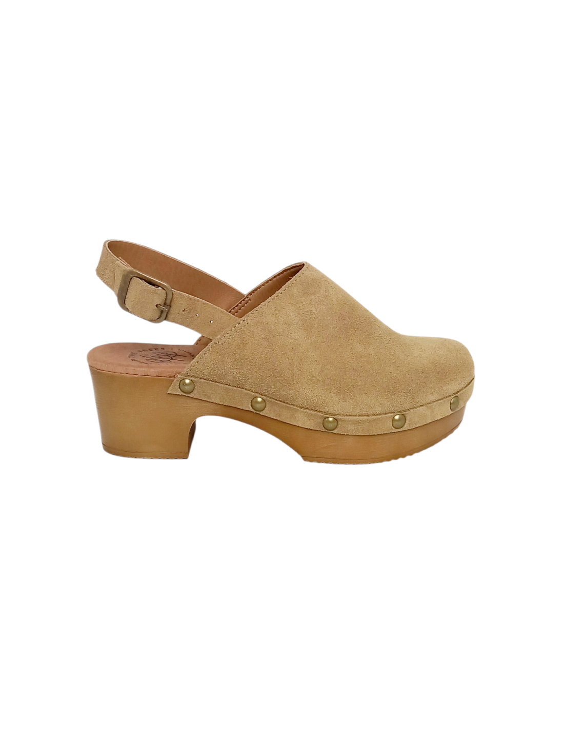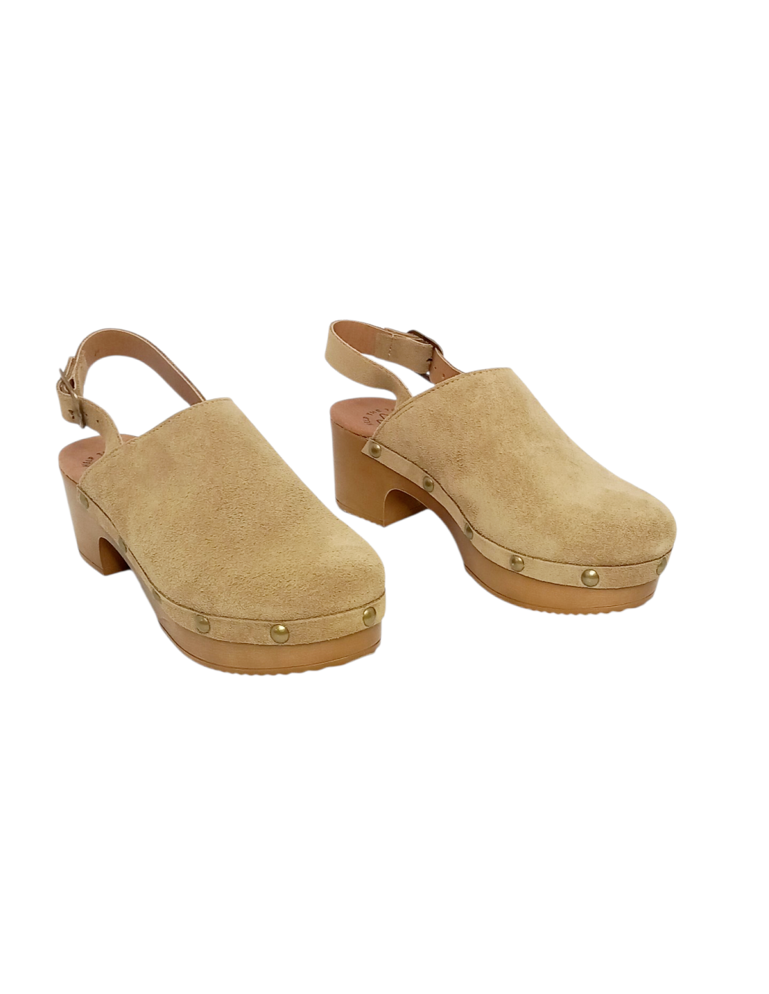 Zueco fabricado en piel serraje de primera calidad en color beige, con tachuelas en la unión con la suela.